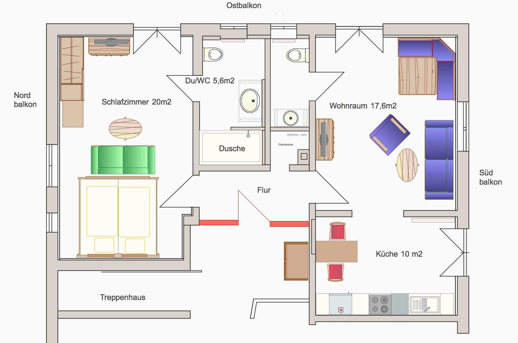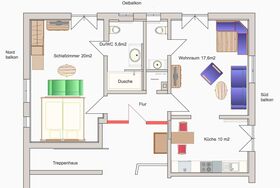 Große Ferienwohung, 60 m2, umlaufender Balkon N/O/S. Schlafzimmer DU/WC, separates WC beim Wohnraum. Komplett eingerichtete Küche mit Spülmaschine und Herd, Sitzecke und Ausziehcouch im Wohnraum.