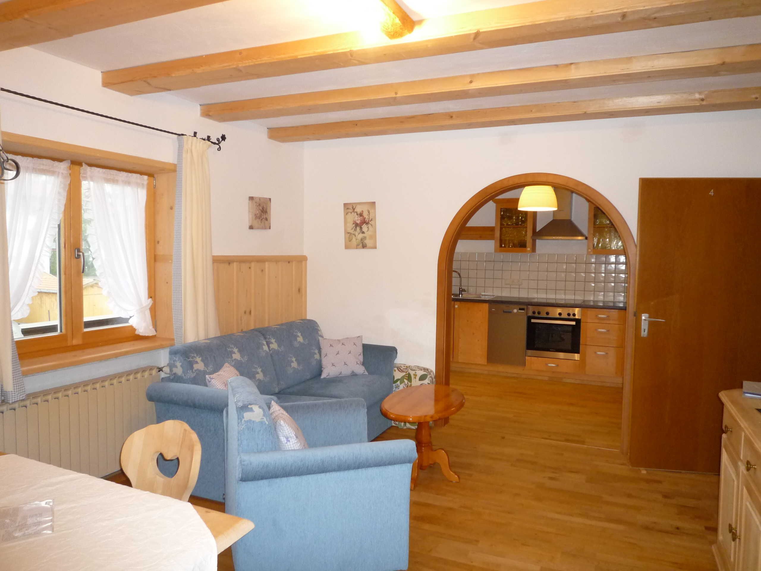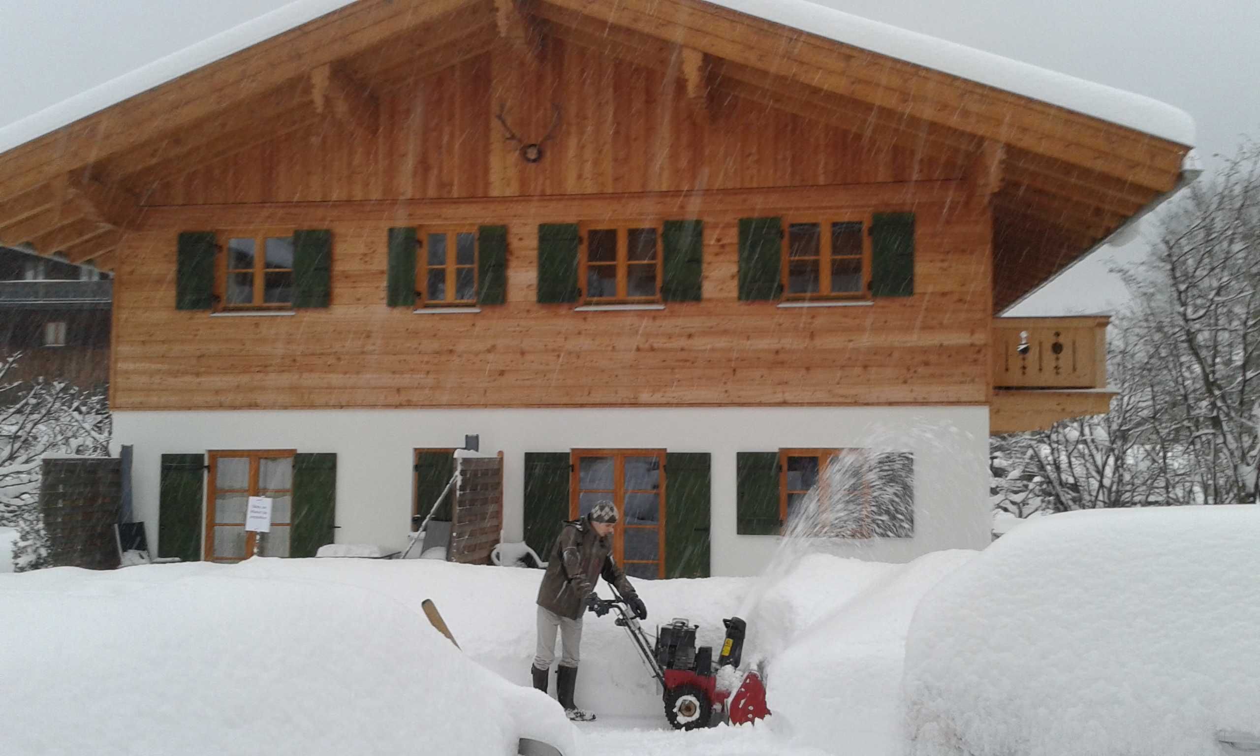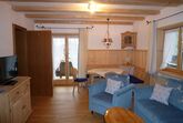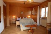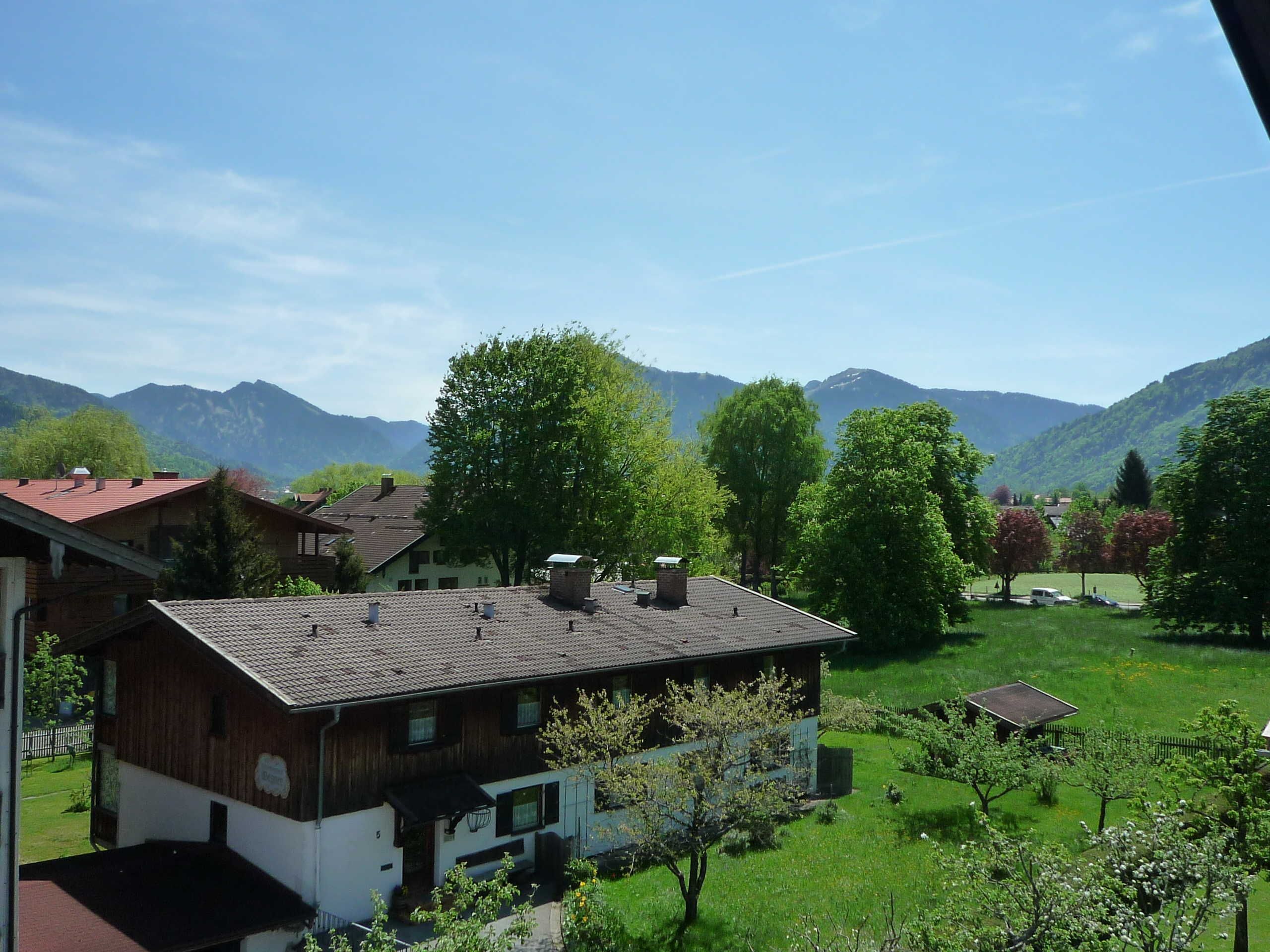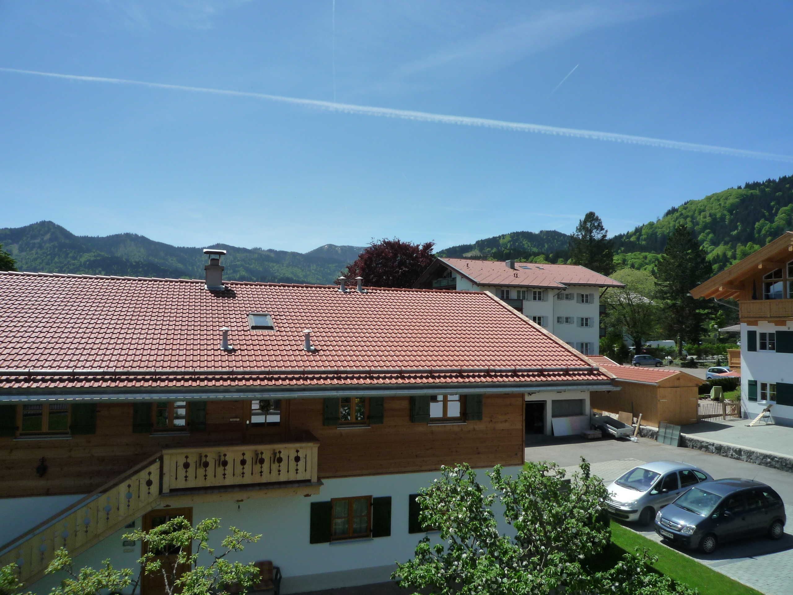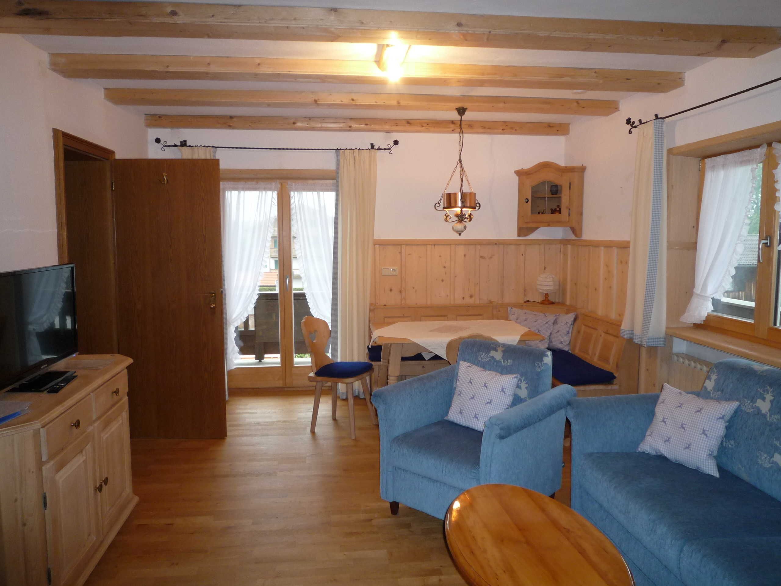 Große 60 m2 Ferienwohung im 1.OG. Umlaufender Balkon, N/O/S. Eingerichtet im bayrischen Stil. Ausblick auf die umliegenden Berge und den Garten. Schlafzimmer mit Doppelbett, DU/WC.
