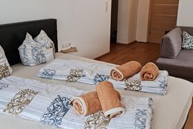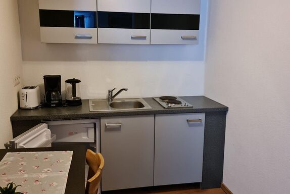 NEUES Studio (ca. 30 m²) mit offenem Wohn- Schlafraum mit 1 Doppelbett, Schlafcouch (Schlafmöglichkeit für die 3. Person) 1 vollausgestattete Küchenzeile (2 Plattenherd, Kühlschrank mit Gefrierfach, Wasserkocher, Toaster, uvm.) mit Flat-TV, 1 Badezimmer mit Dusche/WC.