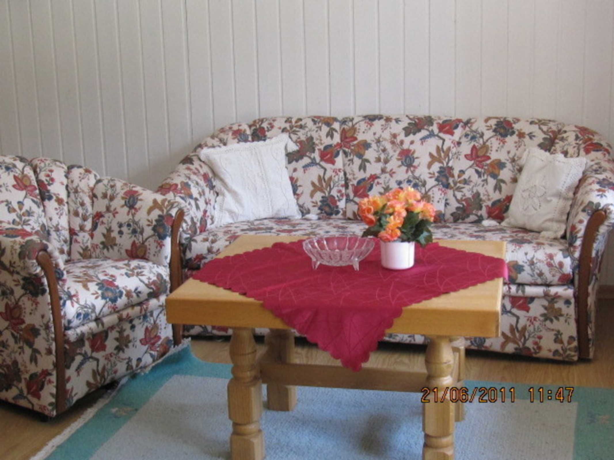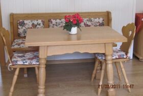 Möbel im Landhausstil, ausziehbare Schlafcouch, Laminatboden und Teppichboden.