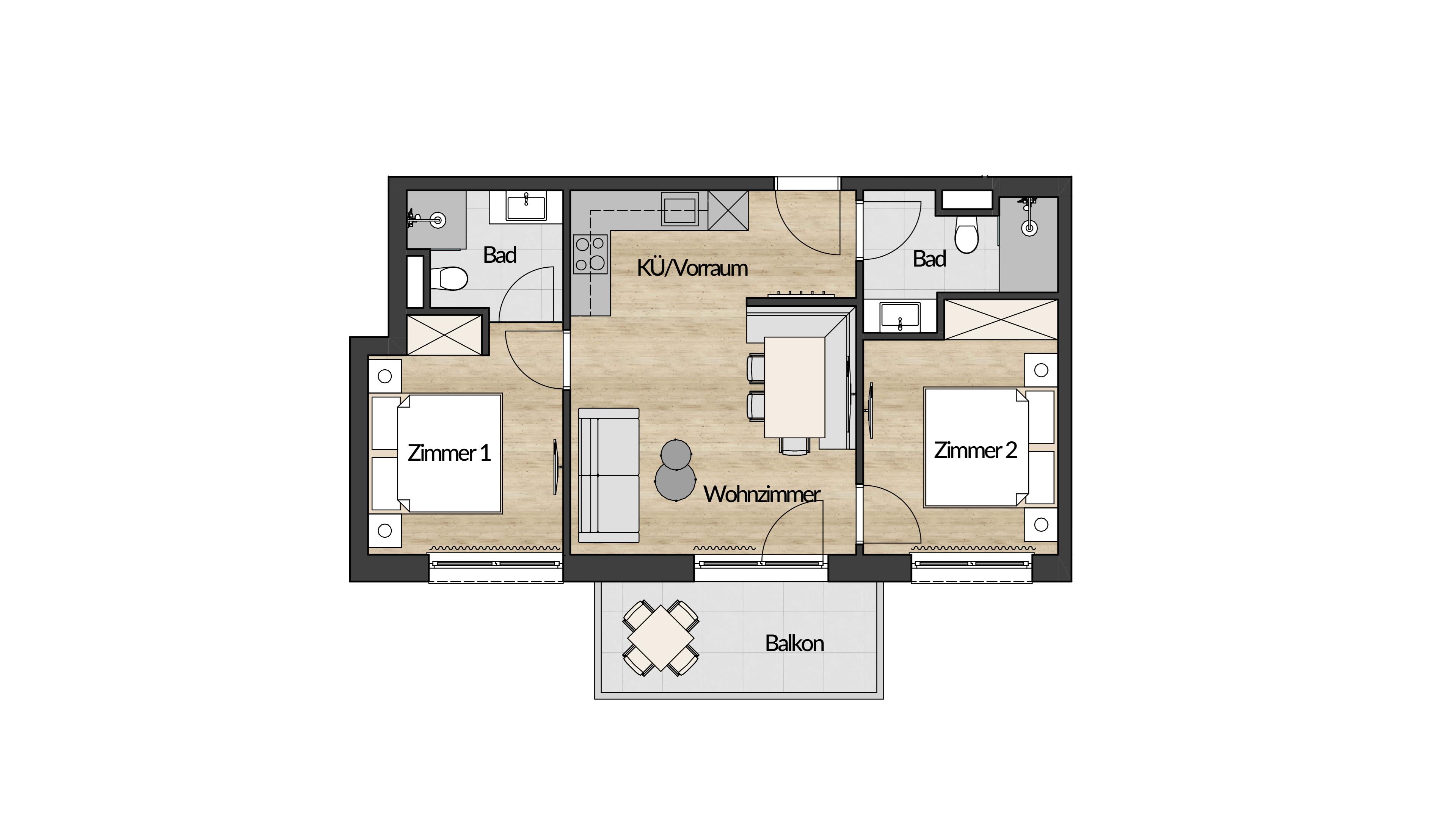 NEUES Appartement Balcony A (ca. 54 m²): 2 Doppelzimmern, 2 Badezimmern mit Dusche/WC, 1 vollausgestatteten Wohnküche (Cerankochfeld, Backofen, Mikrowelle, Geschirrspülmaschine, Kühlschrank mit Tiefkühlfach, Kapsel-Kaffeemaschine, Wasserkocher, Toaster uvm.) und komfortablem, ausziehbarem Sofa (Schlafmöglichkeit für 5.+ 6. Person), Smart-TV und Bose Sound Box. Genießen Sie unvergessliche Stunden auf unserem möblierten Balkon.