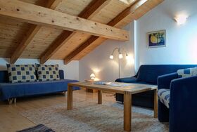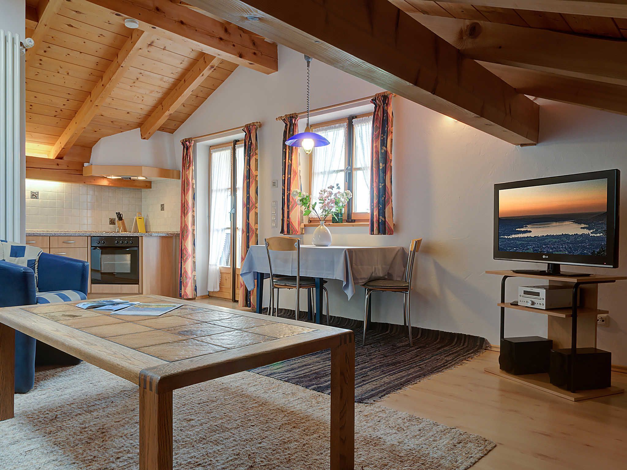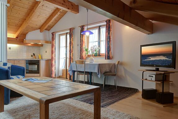 Wohn- und Kochbereich sind kombiniert - die Küche ist besonders großzügig und komplett ausgestattet und bietet einen Essplatz direkt am Fenster. Im Wohnzimmer entspannen Sie in der bequemen Sitzgarnitur mit Flachbild-TV und Radio-CD-Player.