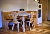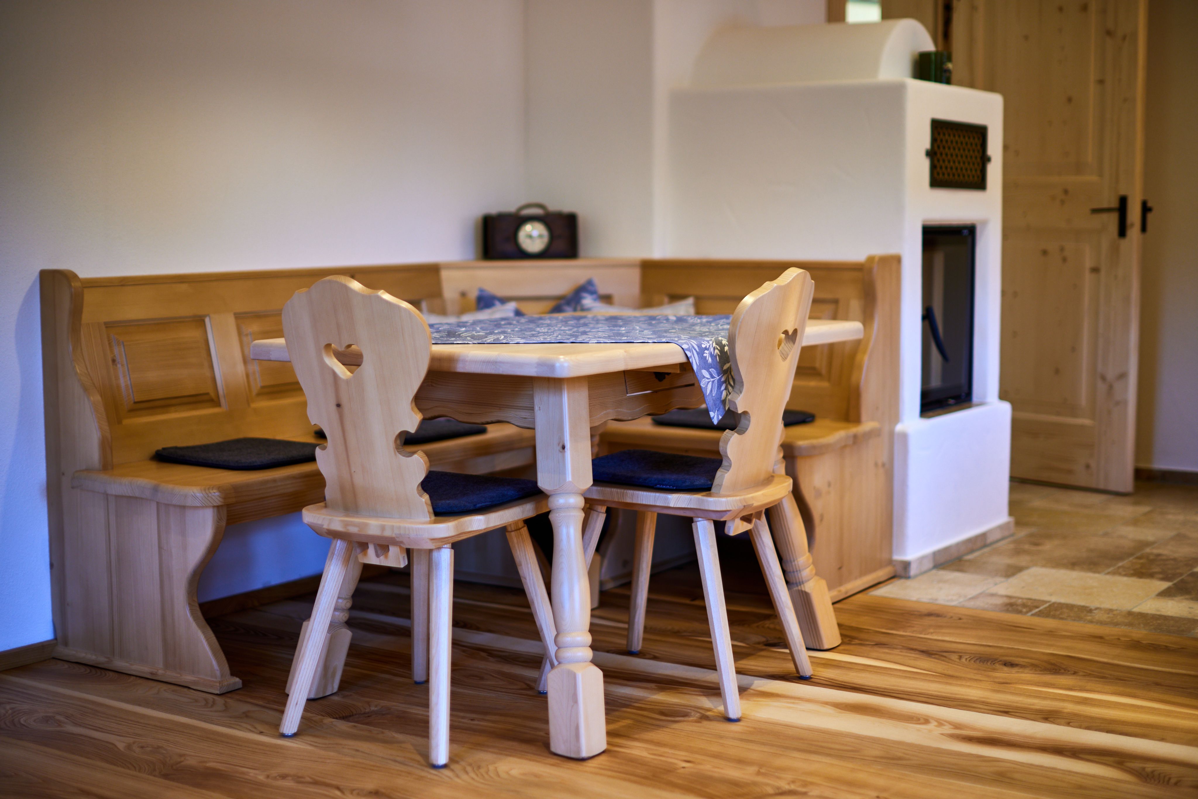 Der gemauerte Holzofen in der vollausgestatteten Wohnküche sorgt für eine angenehme Atmosphäre und vermittelt den Eindruck einer Bauernstube.