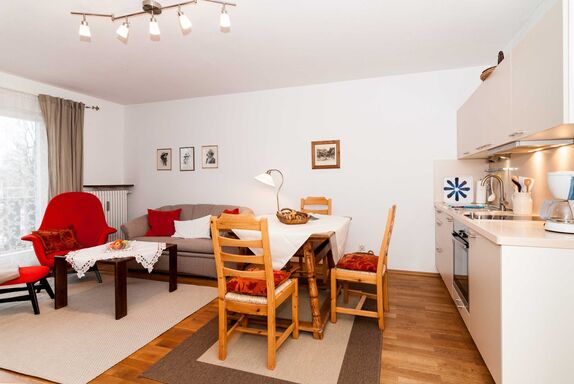 Das Wohnzimmer ist mit einer bequemen Couch, Sessel, Couchtisch und einem Essbereich für 4 Personen möbliert. Die offene in den Wohnbereich integrierte Küche ist gut ausgestattet.