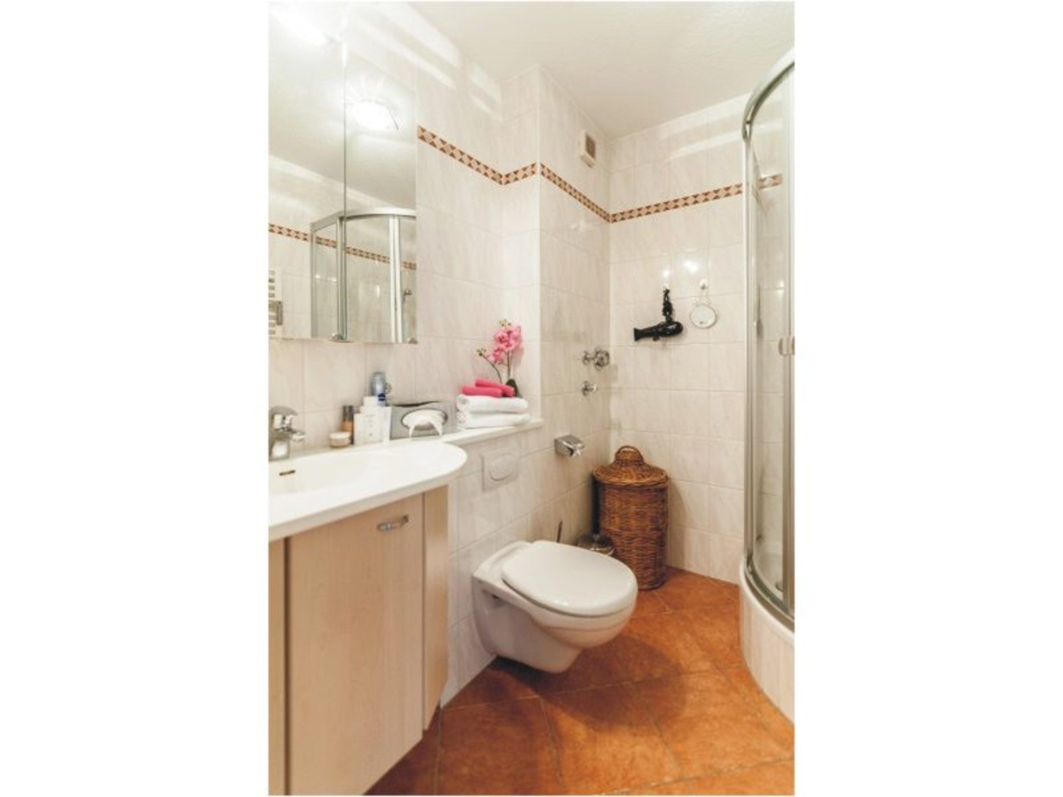 • Bad mit Dusche, Waschbecken, WC