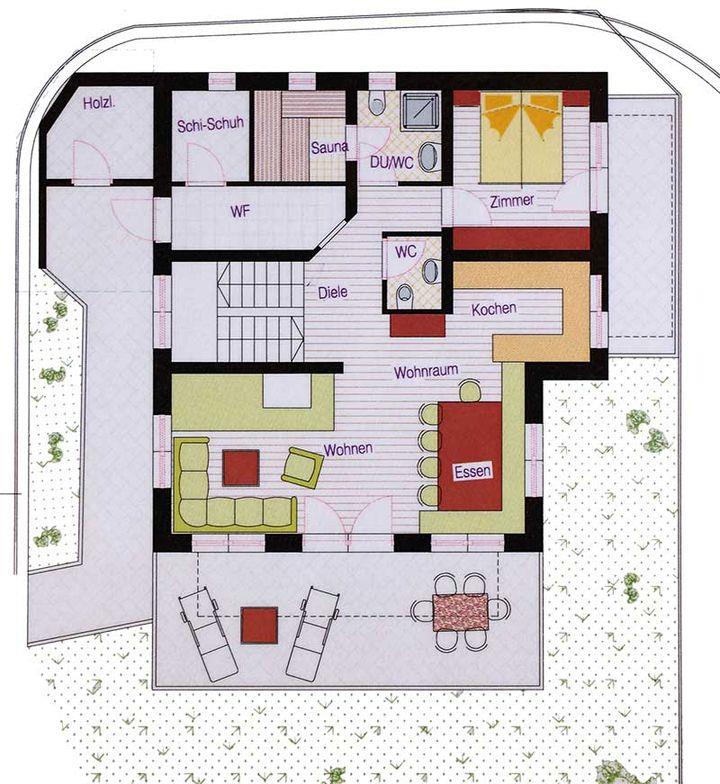 Chalet mit 5 getrennten Schlafzimmern und Flat TV (teilweise mit Schlafcouch), 3 Badezimmer mit Dusche/WC, vollausgestattete Küche mit Spülmaschine, Wohnzimmer mit Esstisch, automatisch beheizter Kachelofen mit gemütlicher Sitzecke, Sauna mit Infrarotkabine, Ski- und Schuhraum, Terrasse, Balkon, WLAN inklusive. Größe: ca. 130 m², ski in ski out - direkt von der Haustüre auf die Skipiste