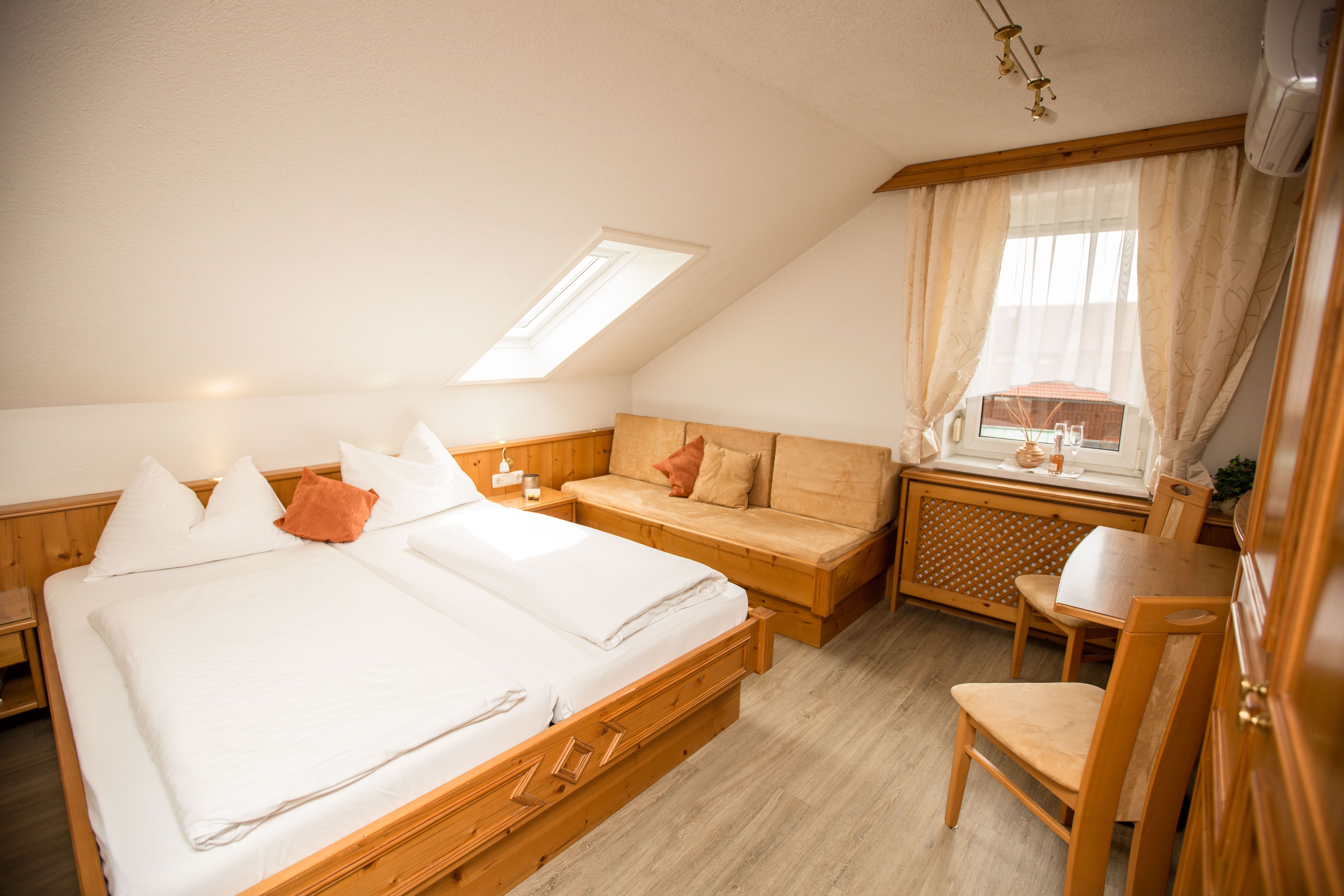 Unsere 4 de luxe Zimmer sind sehr stilvoll ausgestattet. Die Zimmer verfügen teilweise neben dem Doppelbett auch über eine gemütliche Sitzcouch zum Entspannen (als 3. Bett geeignet). Ein Flat-Screen oder Kabel-TV sowie W-Lan Anschluss und Klimaanlage runden das Angebot ab. Badezimmer mit DU, Waschbecken, WC und Fön.