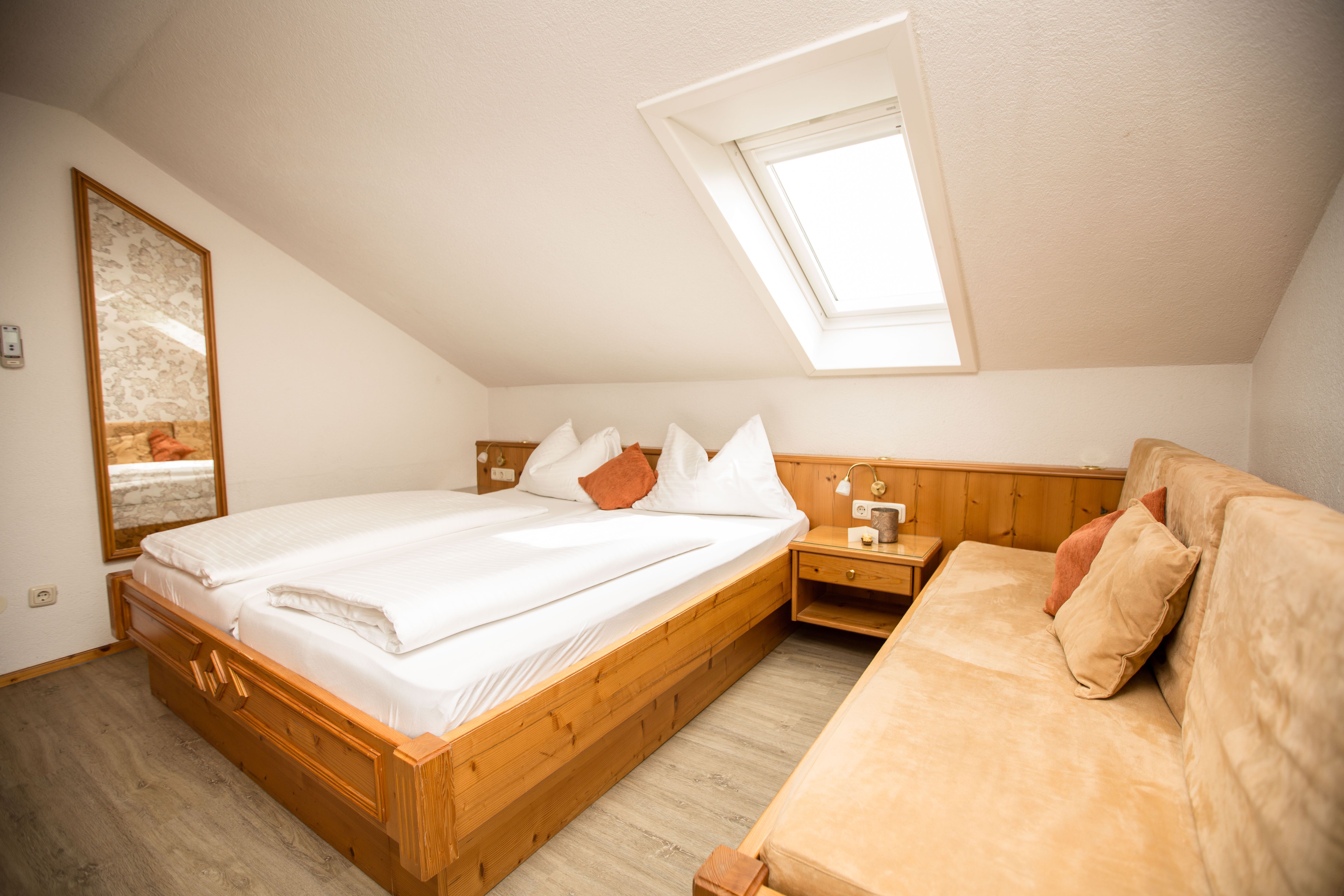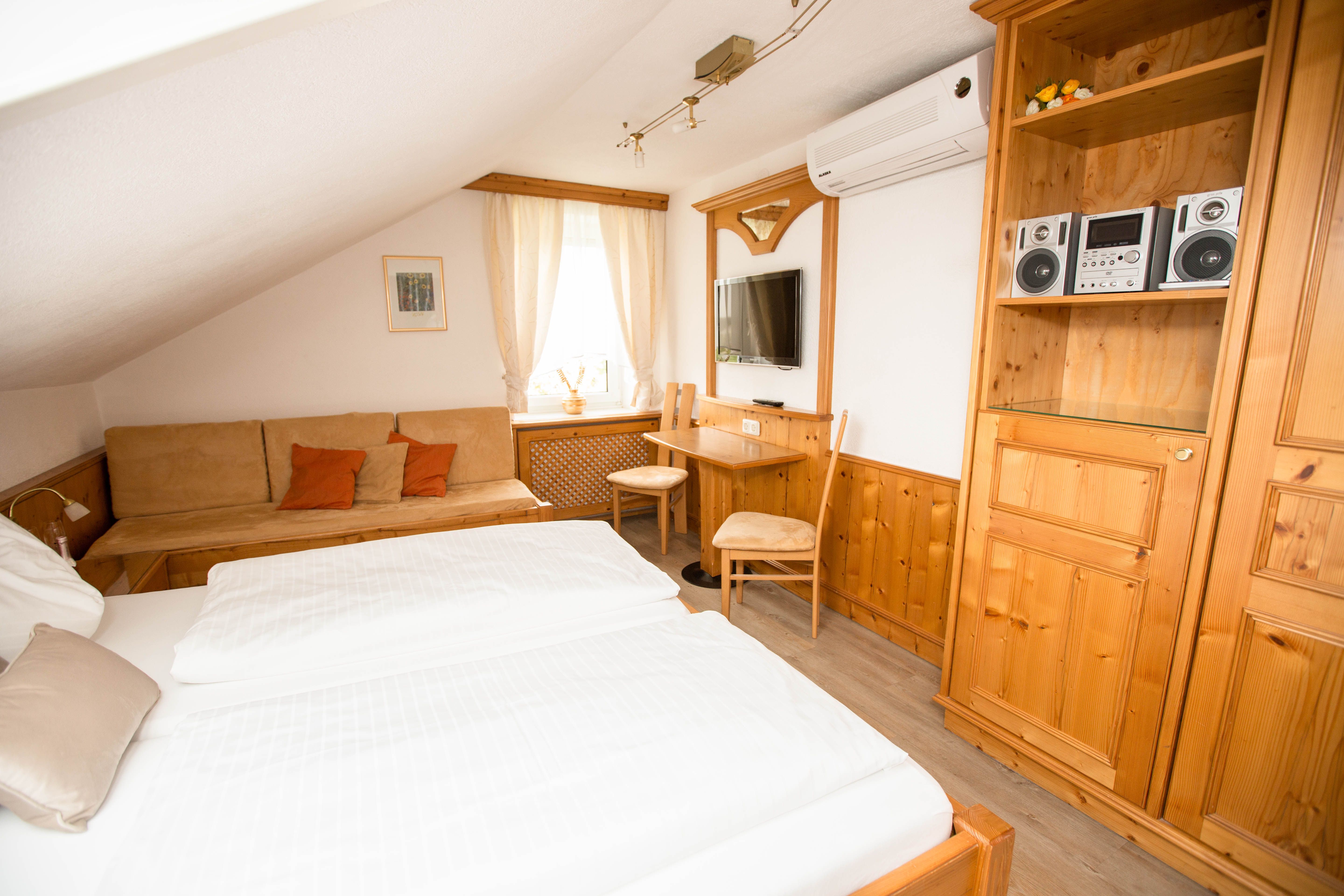 Unsere 4 de luxe Zimmer sind sehr stilvoll ausgestattet. Die Zimmer verfügen teilweise neben dem Doppelbett auch über eine gemütliche Sitzcouch zum Entspannen (als 3. Bett geeignet). Ein Flat-Screen oder Kabel-TV sowie W-Lan Anschluss und Klimaanlage runden das Angebot ab. Badezimmer mit DU, Waschbecken, WC und Fön.