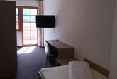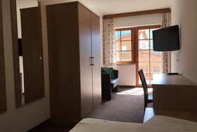 großzügiges Einzelzimmer aus Massivholz, mit Bad oder Dusche, WC, Sitzgelegenheit, SAT-TV, Balkon.