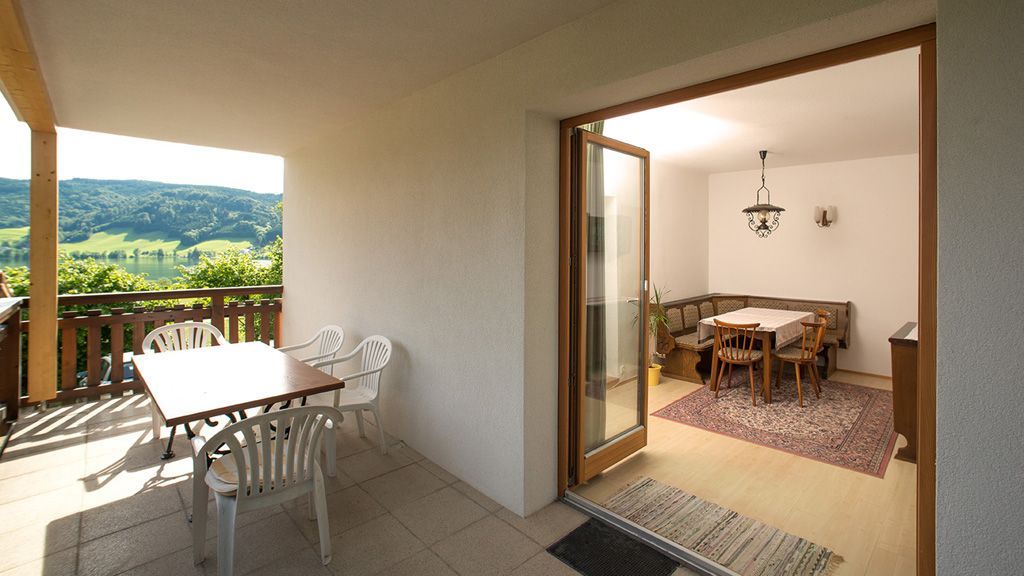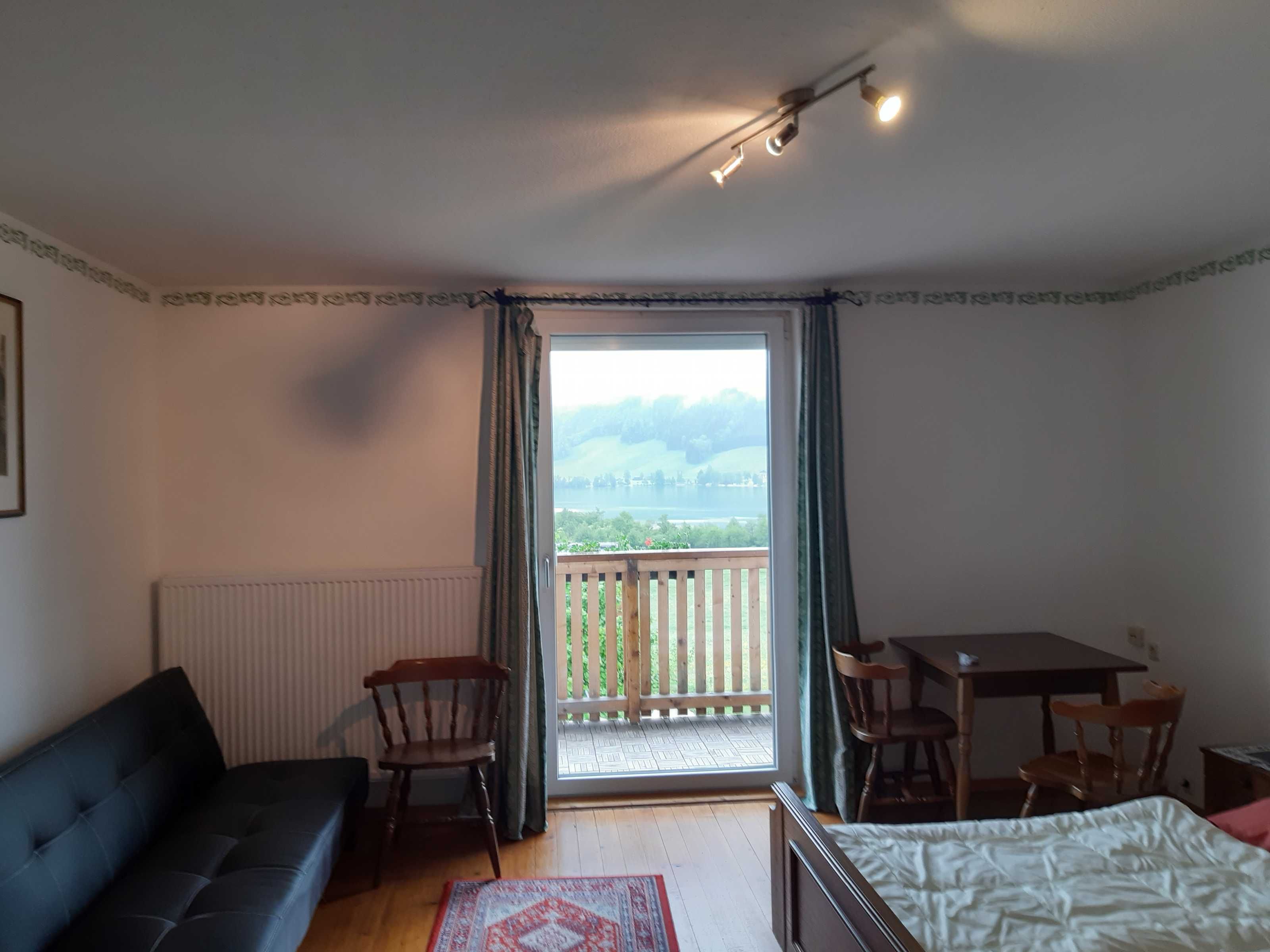 Die Ferienwohnung Seeblick besteht aus zwei Schlafzimmern mit zwei bzw. drei Schlafplätzen. Eines der Schlafzimmer besitzt eine eigene Sanitäreinheit mit Dusche/WC, zusätzlich ist die Wohnung mit einem weiteren WC und einem zweiten Badezimmer ausgestattet. In der großzügig dimensionierten Wohnküche finden bei Bedarf noch zwei Personen Platz. Südseitig befindet sich ein großer Balkon mit fantastischer Aussicht auf den nahegelegenen Irrsee. Freies WLAN steht überall in der Wohnung zur Verfügung.
