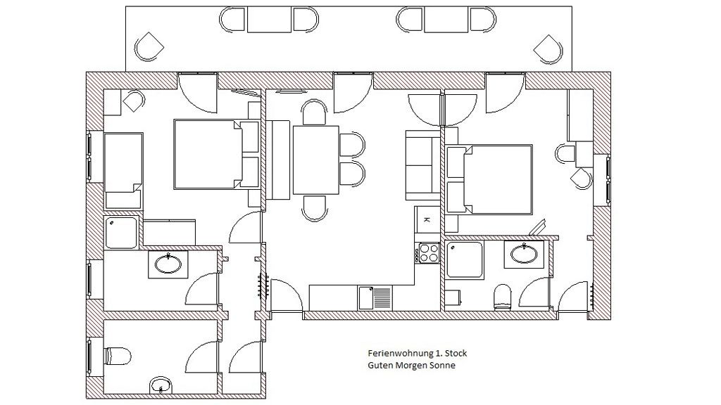Die Wohnung besteht aus 2 getrennten Schlafzimmern, jedes mit DU/WC, Kabel-TV und Balkon sowie einer großen Wohnküche mit Couch, Kabel-TV und Balkon.