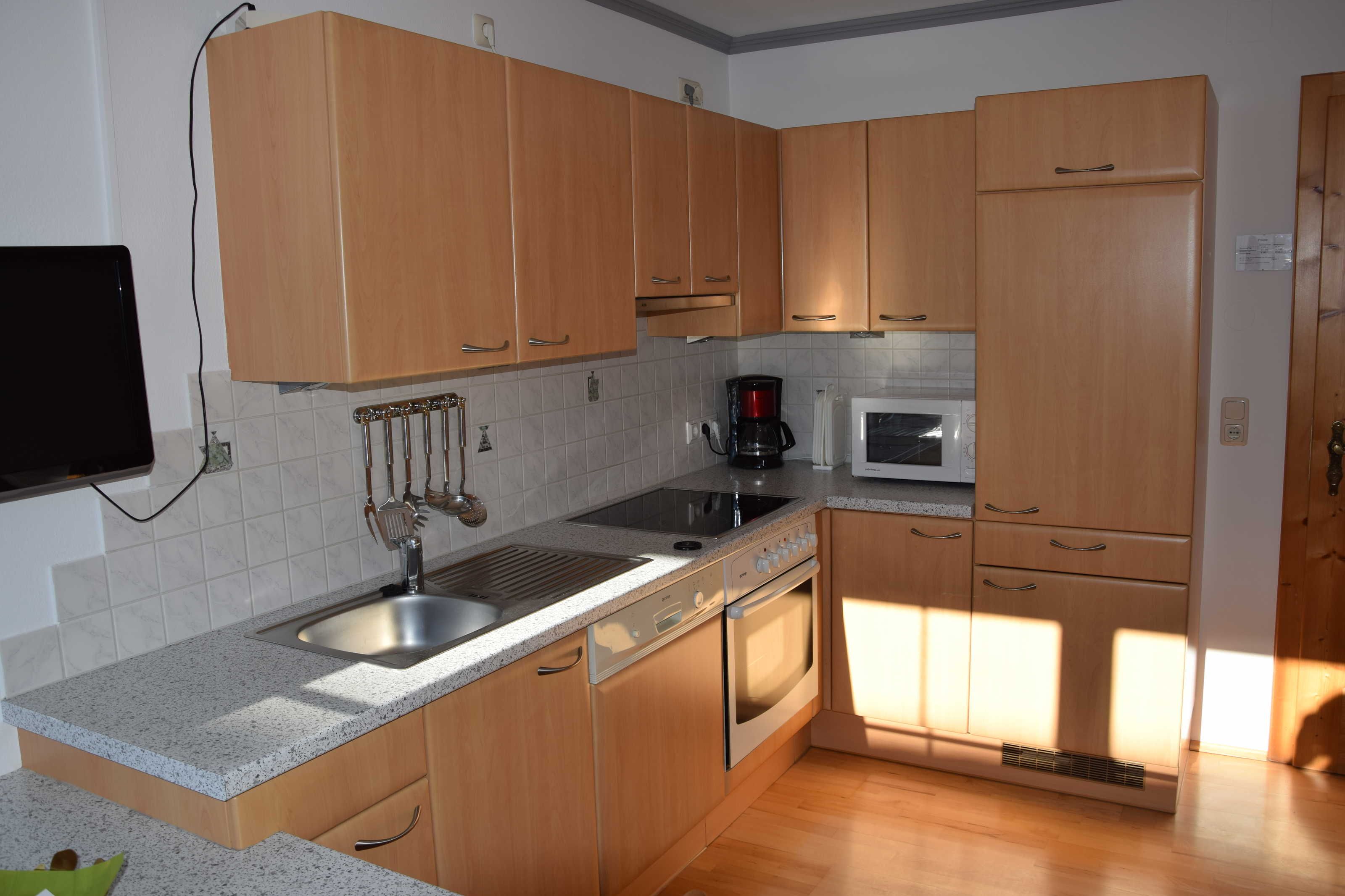 Schlafzimmer, komplett ausgestattete Küche (Geschirrspüler, Mikrowelle, Backrohr, etc.) inkl. Ausziehcouch, Dusche und WC