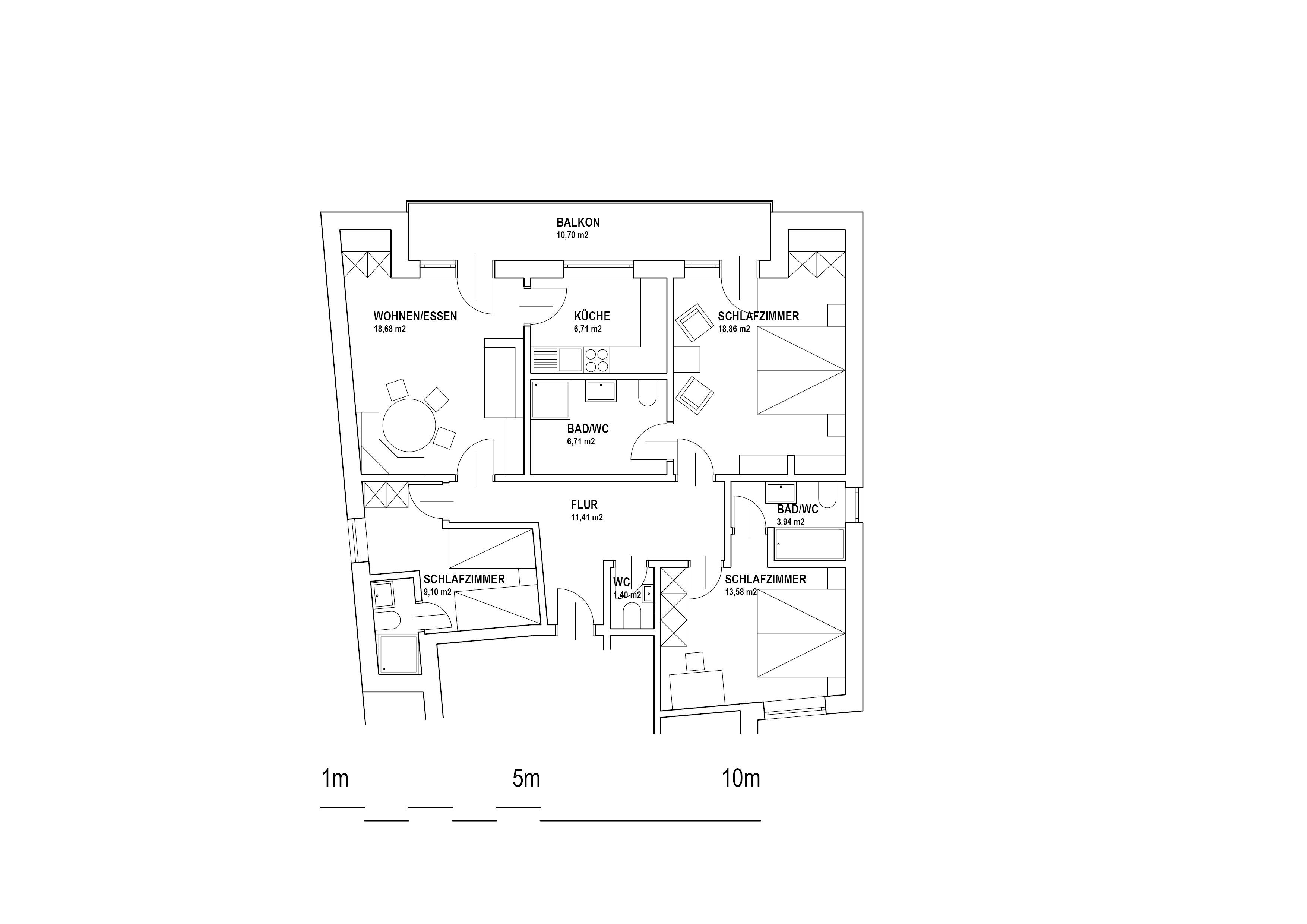 3 Doppelbettschlafzimmer und jedes mit eigenem Bad und WC. Komplett eingerichtete Küche, Wohnzimmer, Vorraum und großer Balkon. Bett- und Frotteewäsche ist im Preis inkludiert.
