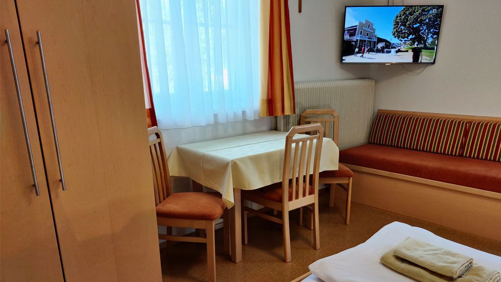 Das Zimmer kann als Dreibettzimmer oder Doppelzimmer gebucht werden. Es befindet sich 1 Doppelbett und eine Ausziehsessel für einen Person darin, ist süd- ostseitig im 1. Stock gelegen, hat einen Balkon, Zentralheizung, einen Tisch und 3 Stühle und ist besonders für Familien geeignet. Das Zimmer ist ausgestattet mit Dusche, Fließwasser und WC in eigener Nasszelle. Hand- u. Badetücher sind vorhanden, ebenso wie Sat-TV, Gartenmöbel am Balkon und im Garten. Kleiderschrank und Garderobe sind im Zimmer.