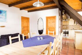 ... liegt im ersten Obergeschoss, gegenüber der Ferienwohnung Drei Zinnen. Die Gesamtfläche der Wohnung beläuft sich auf ca. 90 qm.