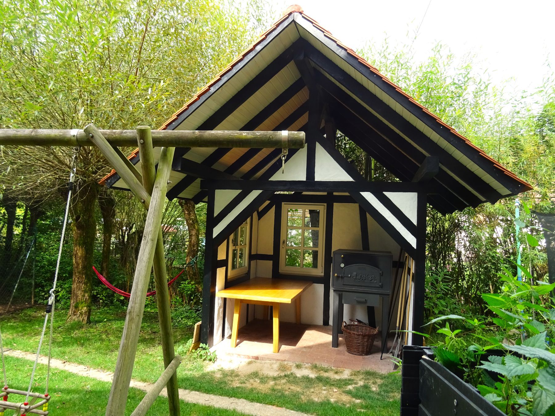 Pavillon als Gemeinschaftsraum mit integrierter Feuer- und Grillstelle. (Auch im Winter).