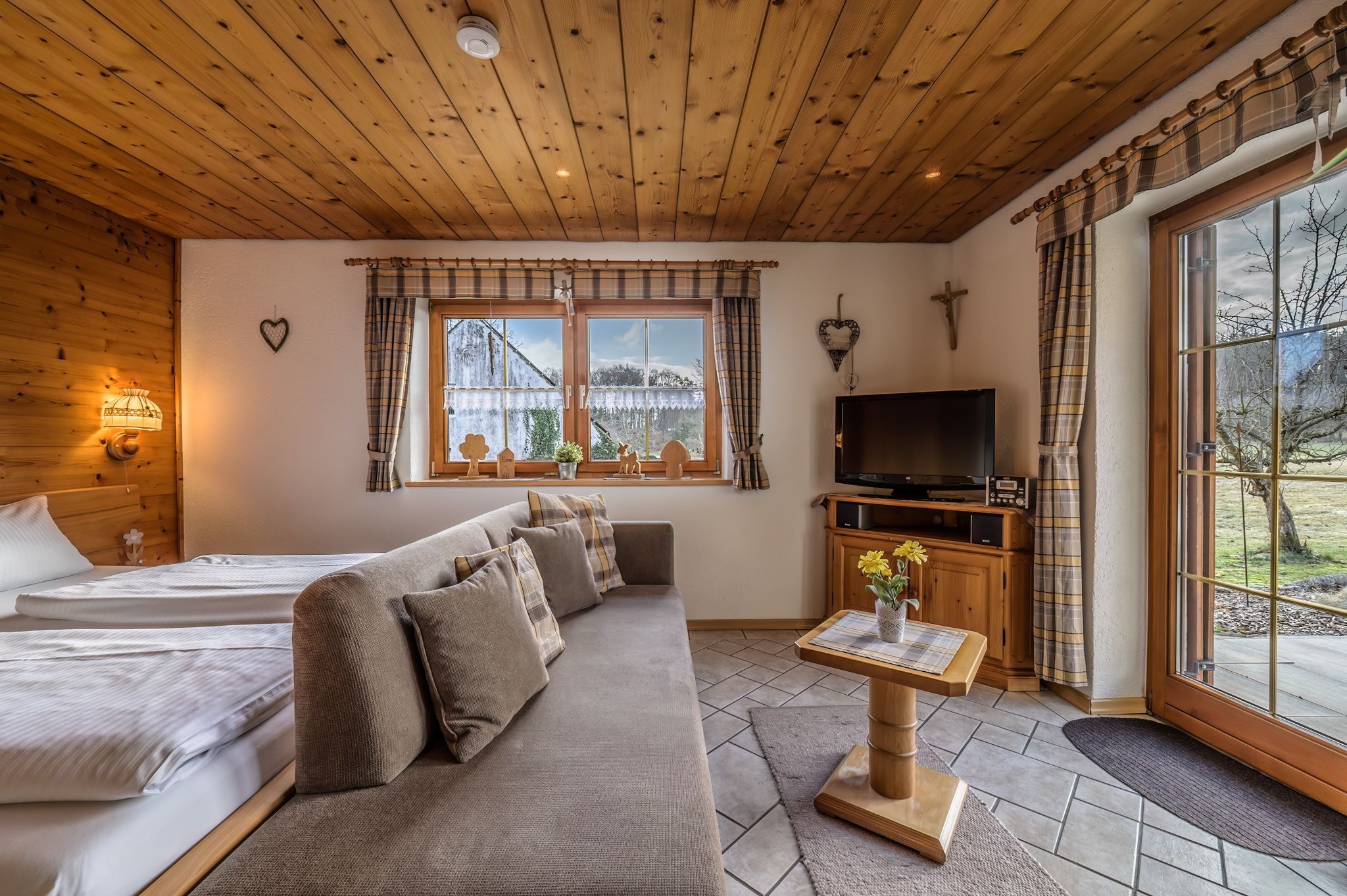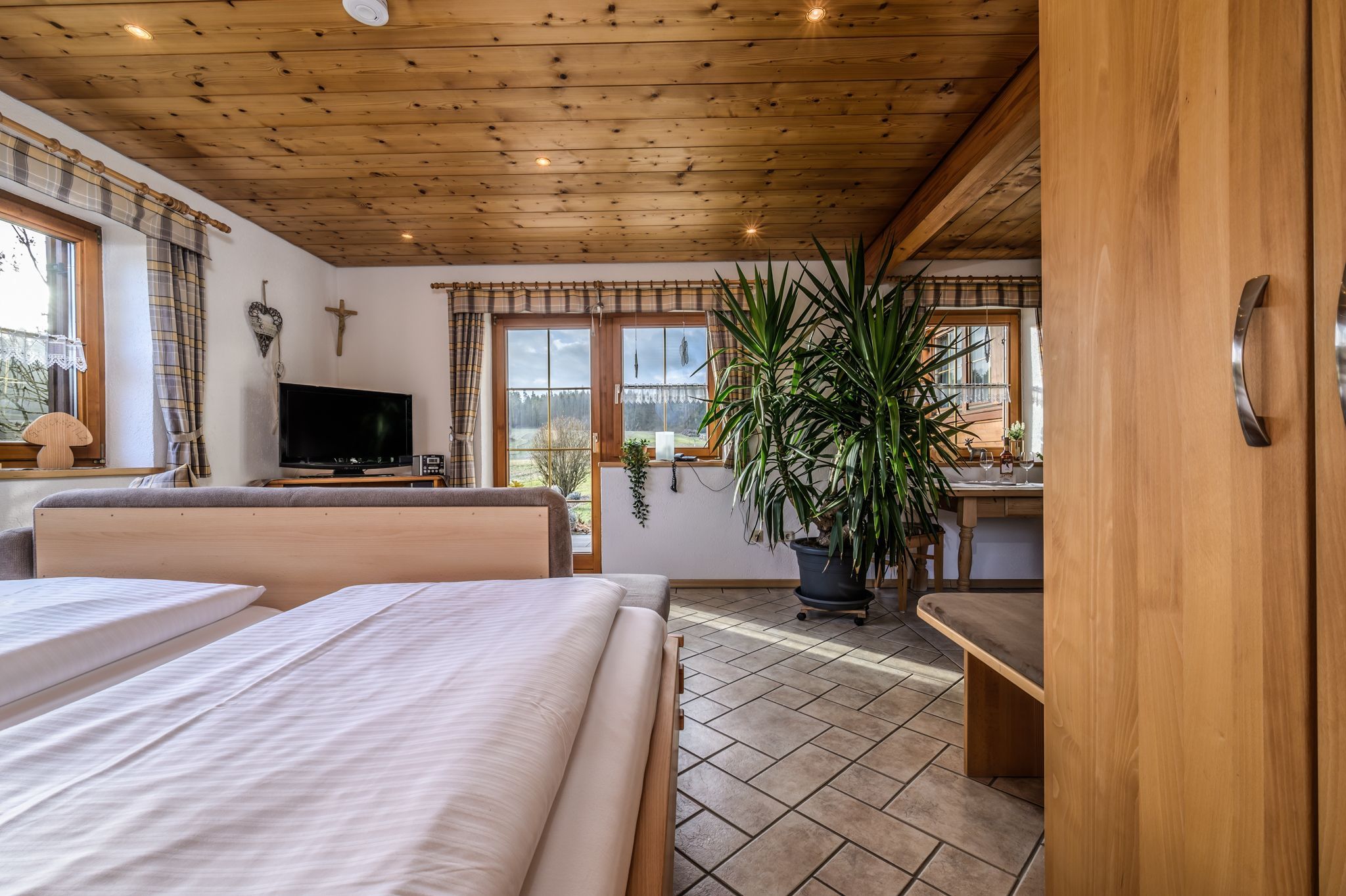 Wohn-Schlafraum mit Doppelbett, gemütlicher Couch und Sitzgruppe