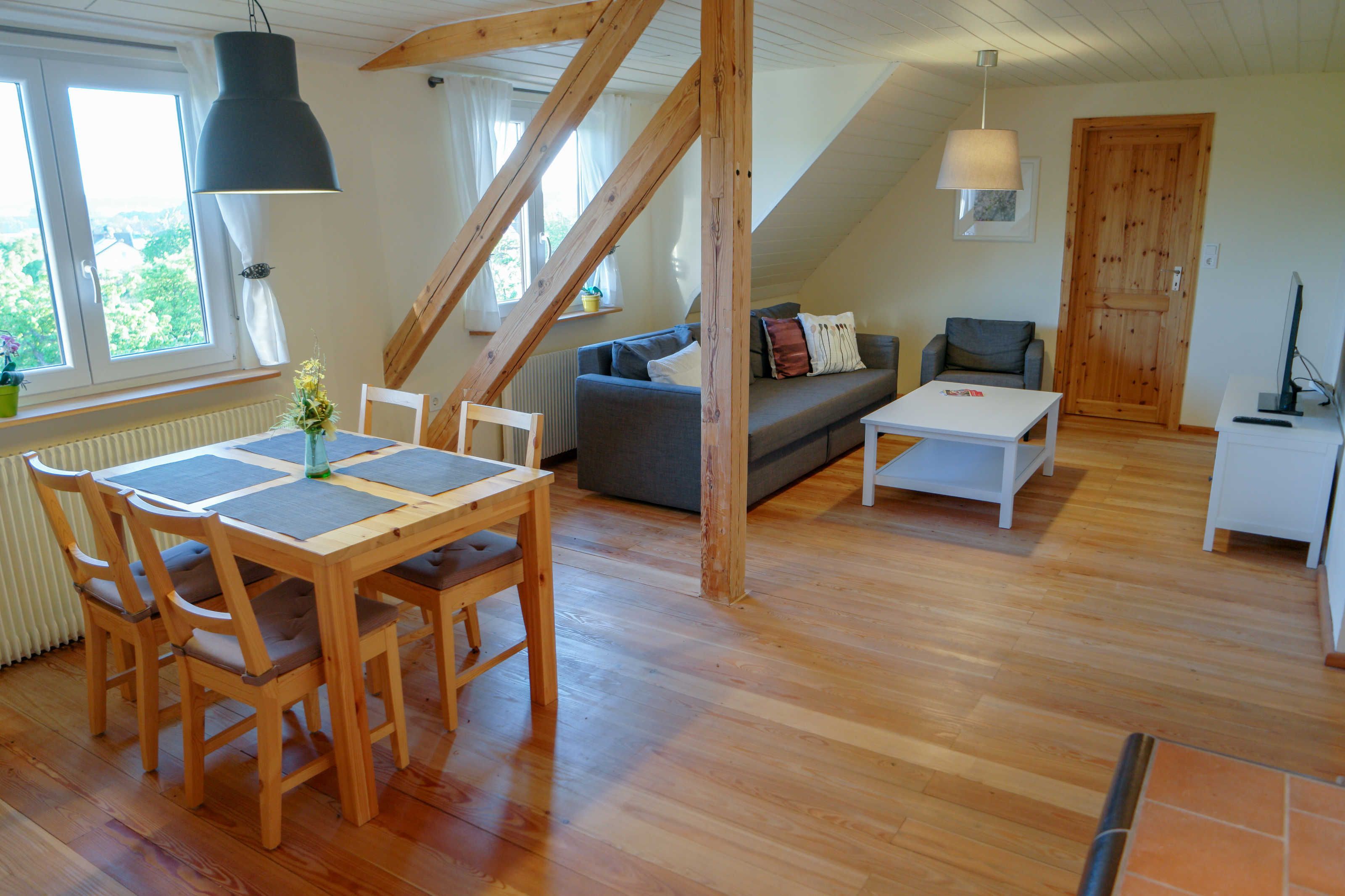 Sie erwartet ein großer Wohn- und Essbereich mit Blick nach Süden direkt in die Natur sowie ein renoviertes Bad mit Tageslicht. Handtücher, Seife, Toilettenpapier sind vorhanden.
