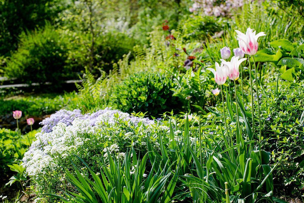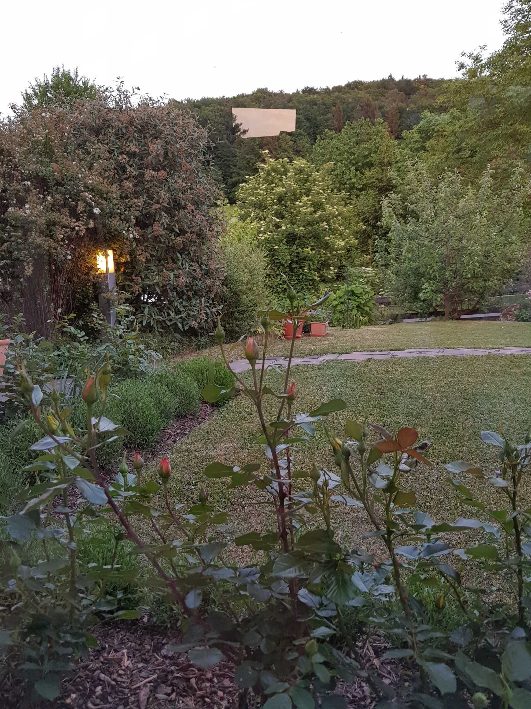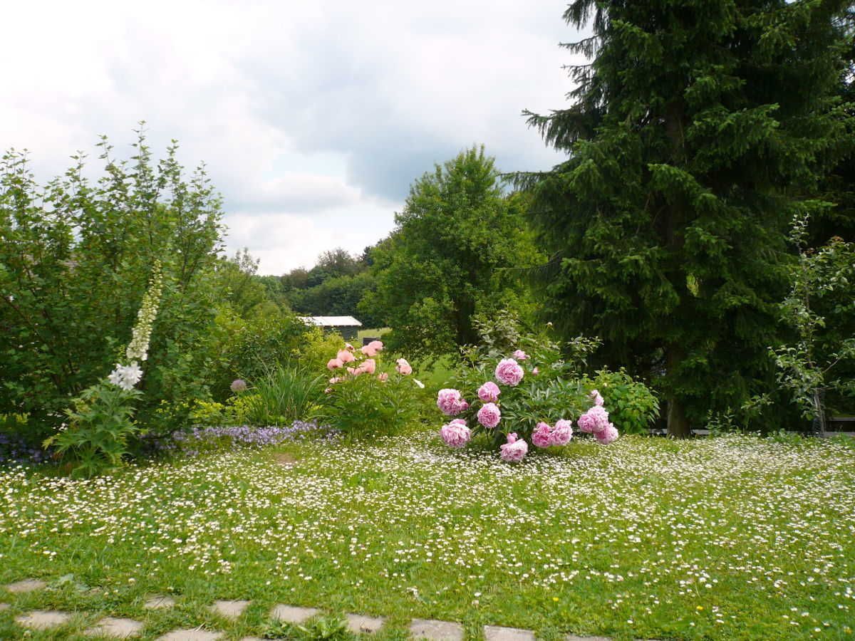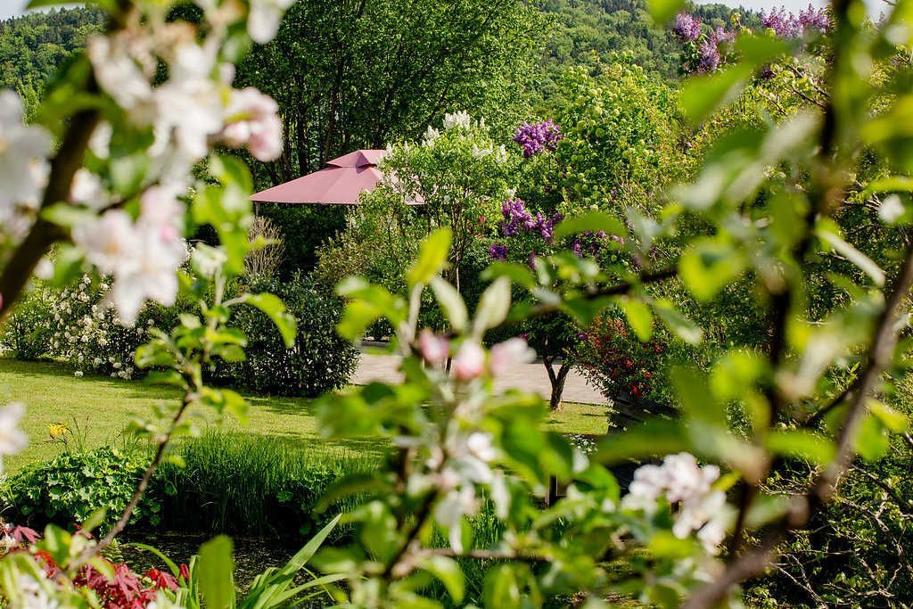 Blick vom Wohnzimmer in den ländlichen sehr gepflegten Garten mit Teich, Gartenmöbeln, Liegestühlen und Grill.