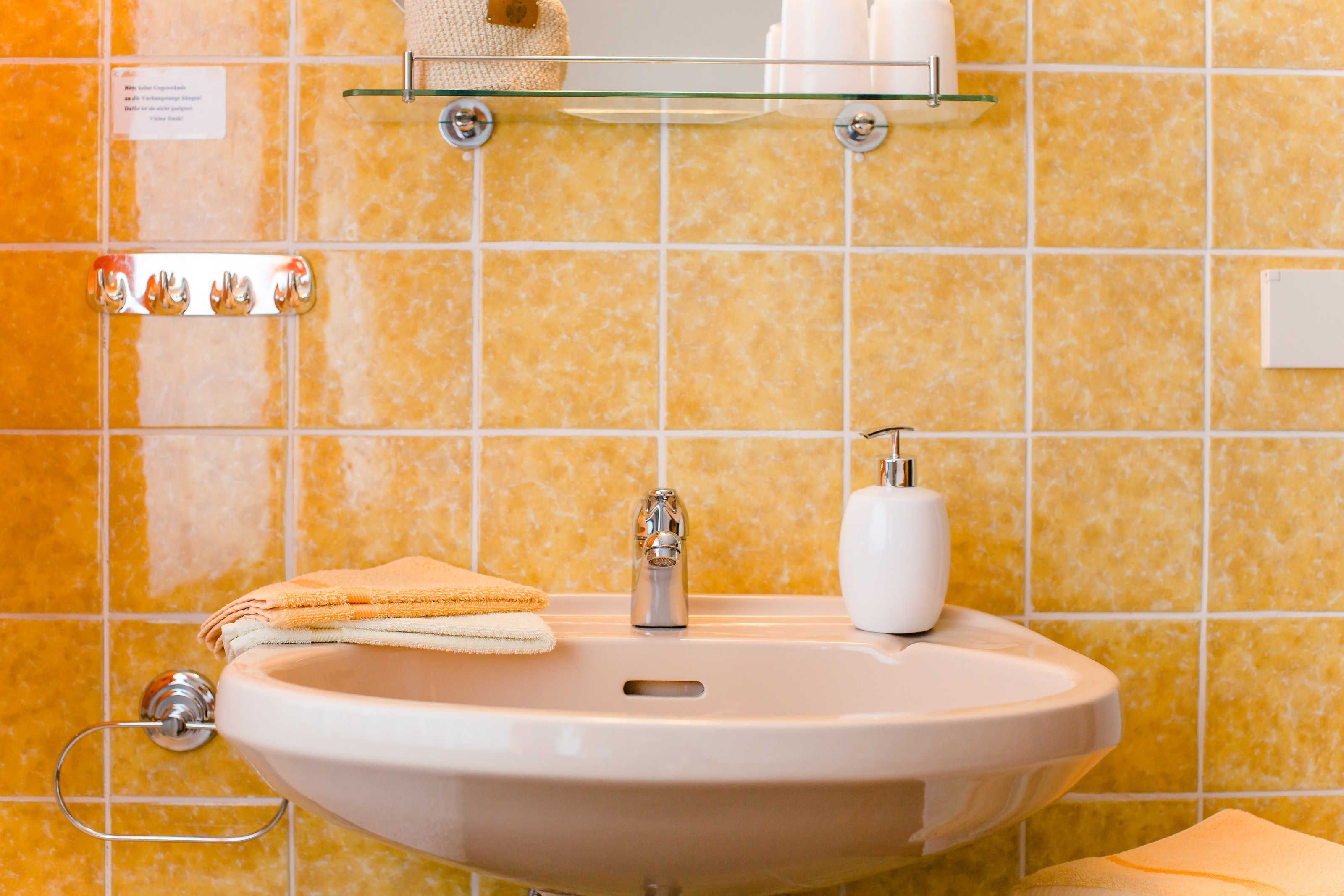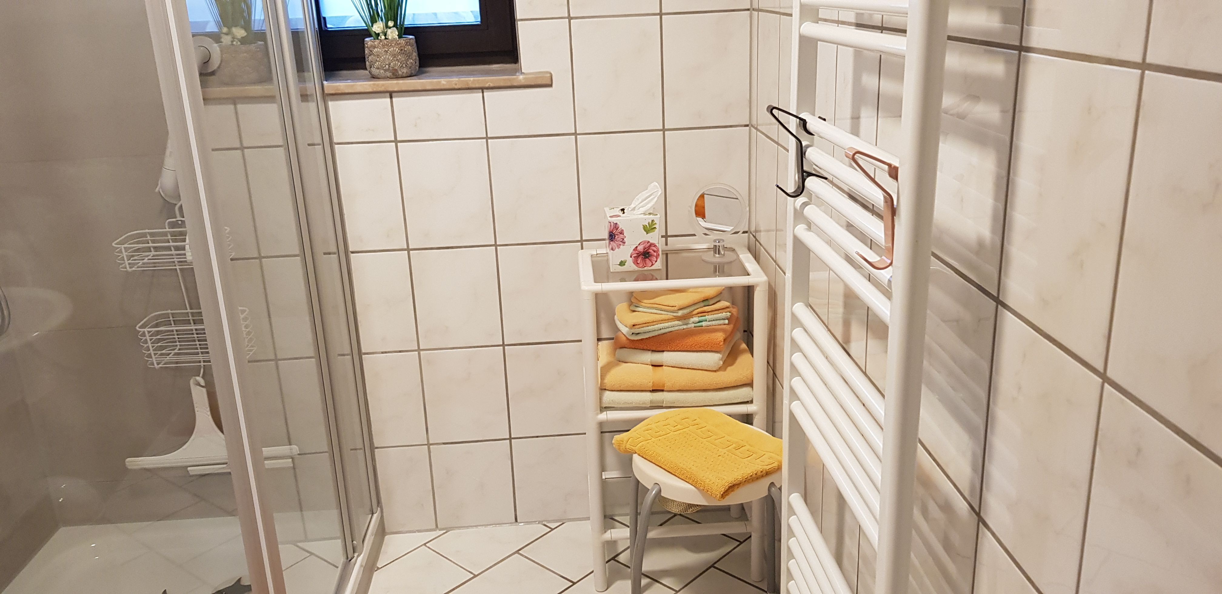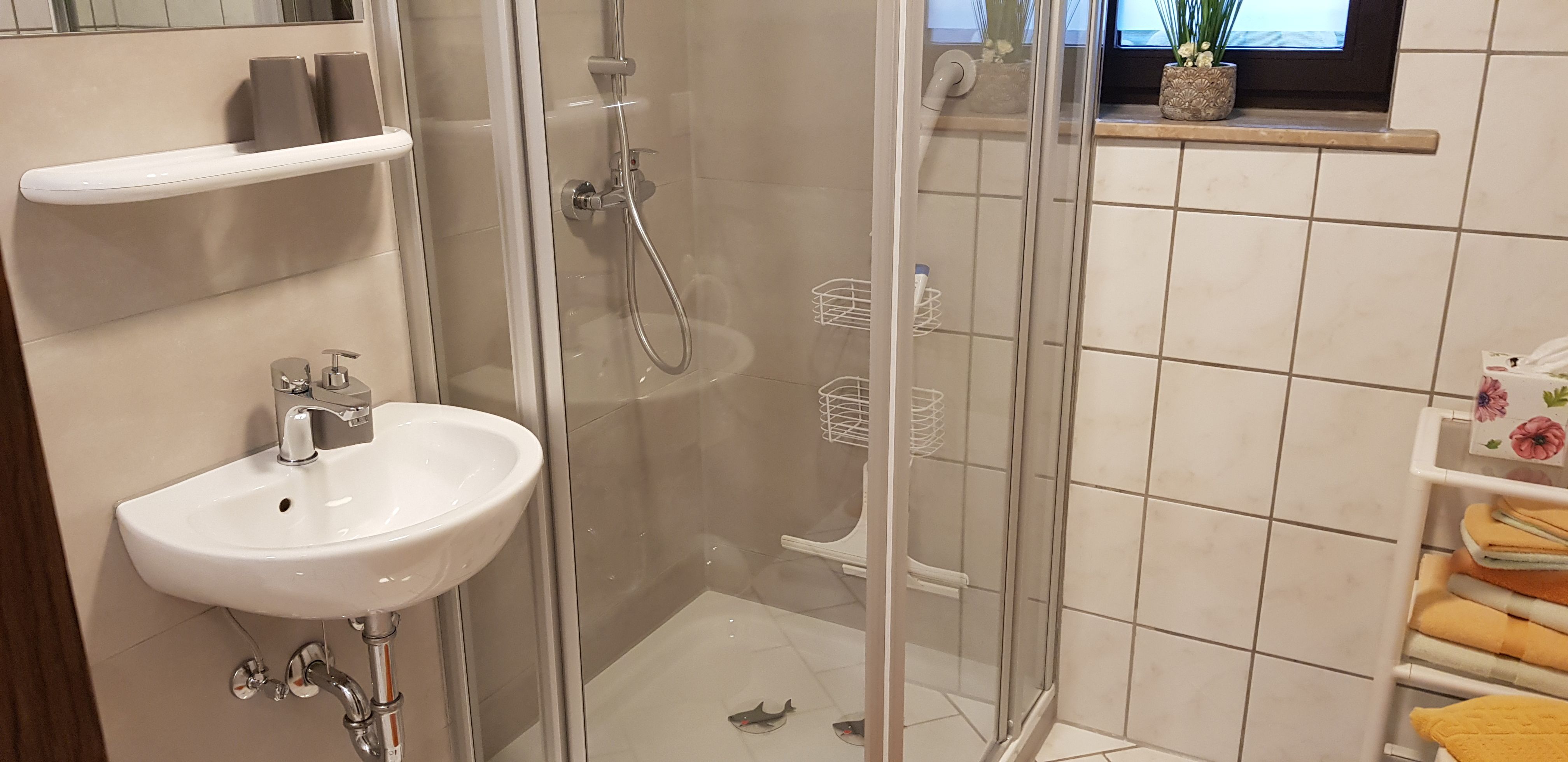 1 Bad: Moderne Dusche mit niedrigem Einstieg, Haltegriffe in der Dusche, auch am WC, Waschbecken, WC, Föhn.