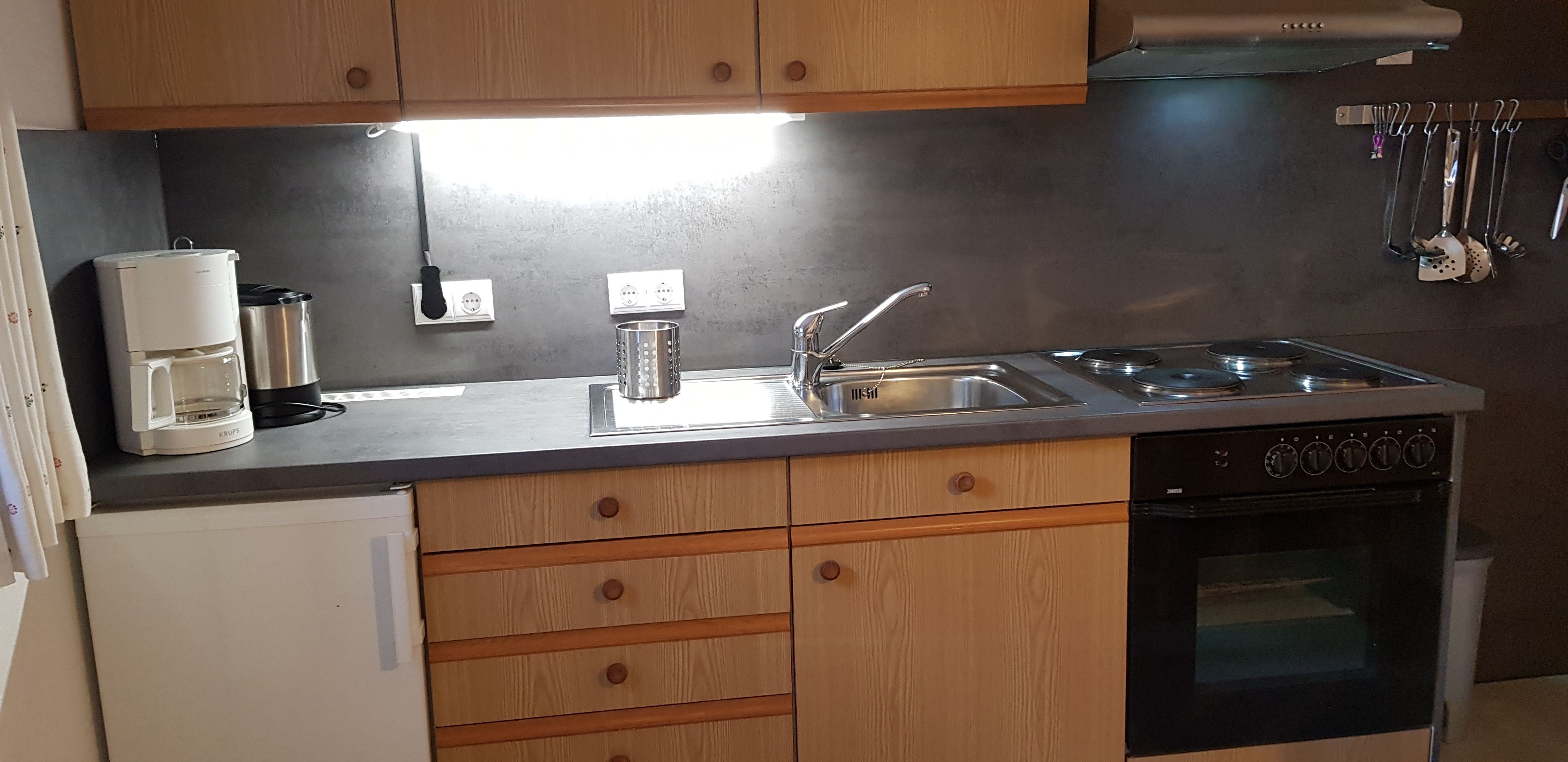 Komplett eingerichtete Küche mit gemütlicher Essecke für bis zu 6 Personen, Kühlschrank mit Gefrierfach, Geschirrspüler, 4- Plattenherd, Backofen, Mikrowelle, Kaffeemaschine, Wasserkocher, Toaster, Eierkocher, Espressokocher, Radio usw., Küchentücher.