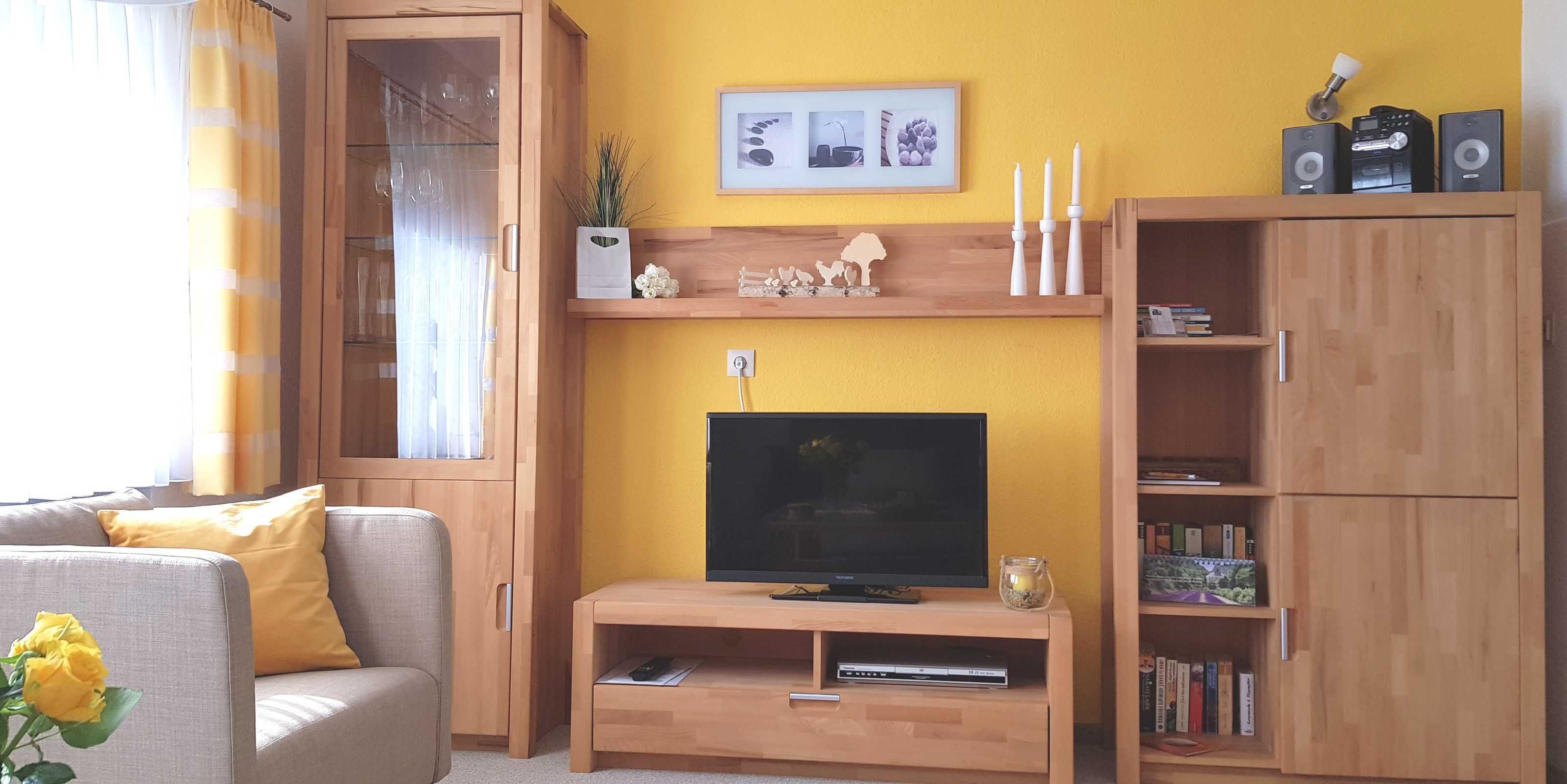 1 modernes gemütliches Wohnzimmer mit komfortabler Sitzgruppe, SAT-TV-Flachbildschirm, DVD, CD, Stereoanlage.
