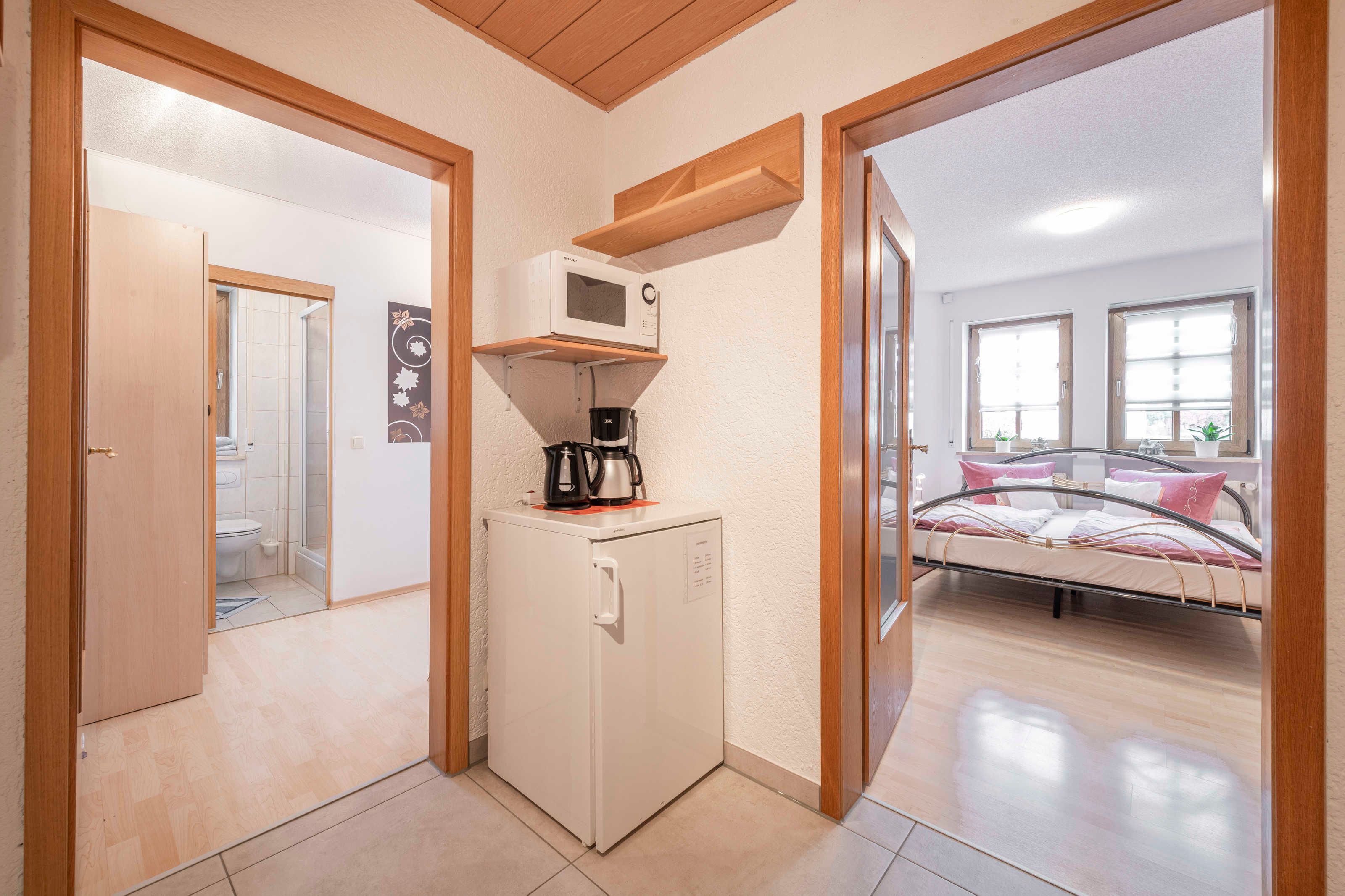 Doppelzimmer mit Frühstück im 2. Stockwerk (nur über Treppe erreichbar) mit 180x200er Bett, Laminatboden und Balkon. Das dazugehörige, geräumige, geflieste Bad ist mit einer begehbaren Dusche und WC ausgestattet. Reichhaltiges Frühstücksbuffet inklusive. Parkplätze und E-Ladestation (Wallbox) am Haus vorhanden.