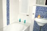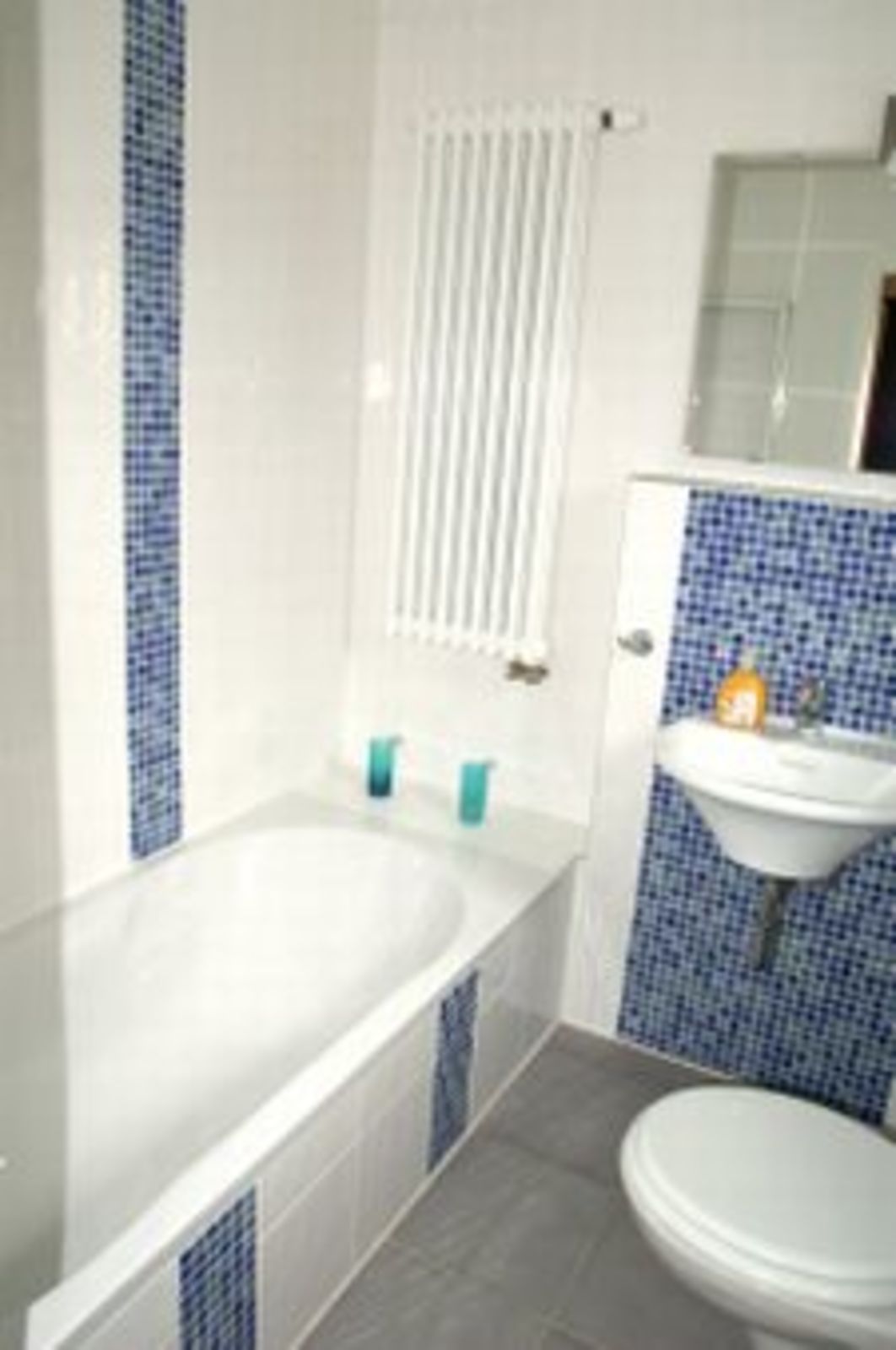 Sie sehnen sich nach Entspannung? Dann genießen Sie ein wohltuendes Vollbad in der gemütlichen Badewanne. Für die Anhänger der schnellen Wäsche steht eine Aufsatzwand zur Verfügung, die im Handumdrehen aus der Wanne eine Großraumdusche zaubert. Die ansprechende Fliesengestaltung in weiß und Blautönen erzeugt ein maritimes Flair, das Sie bereits bei der Morgentoilette erfrischen wird. Tageslicht versteht sich in diesem Bad von selbst.