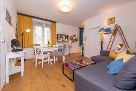 Sehr helle und neu renovierte Ferienwohnung mit 1 Schlafzimmer,Bad/Dusche, WC, Wohnzimmer, große Küche mit Kaffeemaschine und gratis Kaffee,Wohnzimmer mit Couch und Flat-TV,Blick auf den Vormauerstein, Wohnung hat ca. 45m2