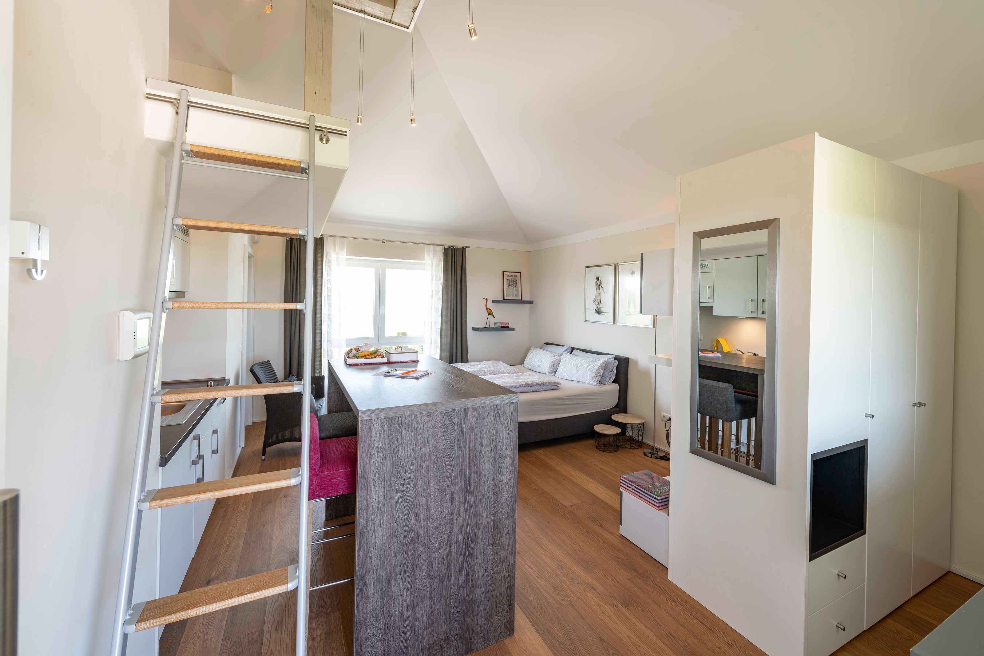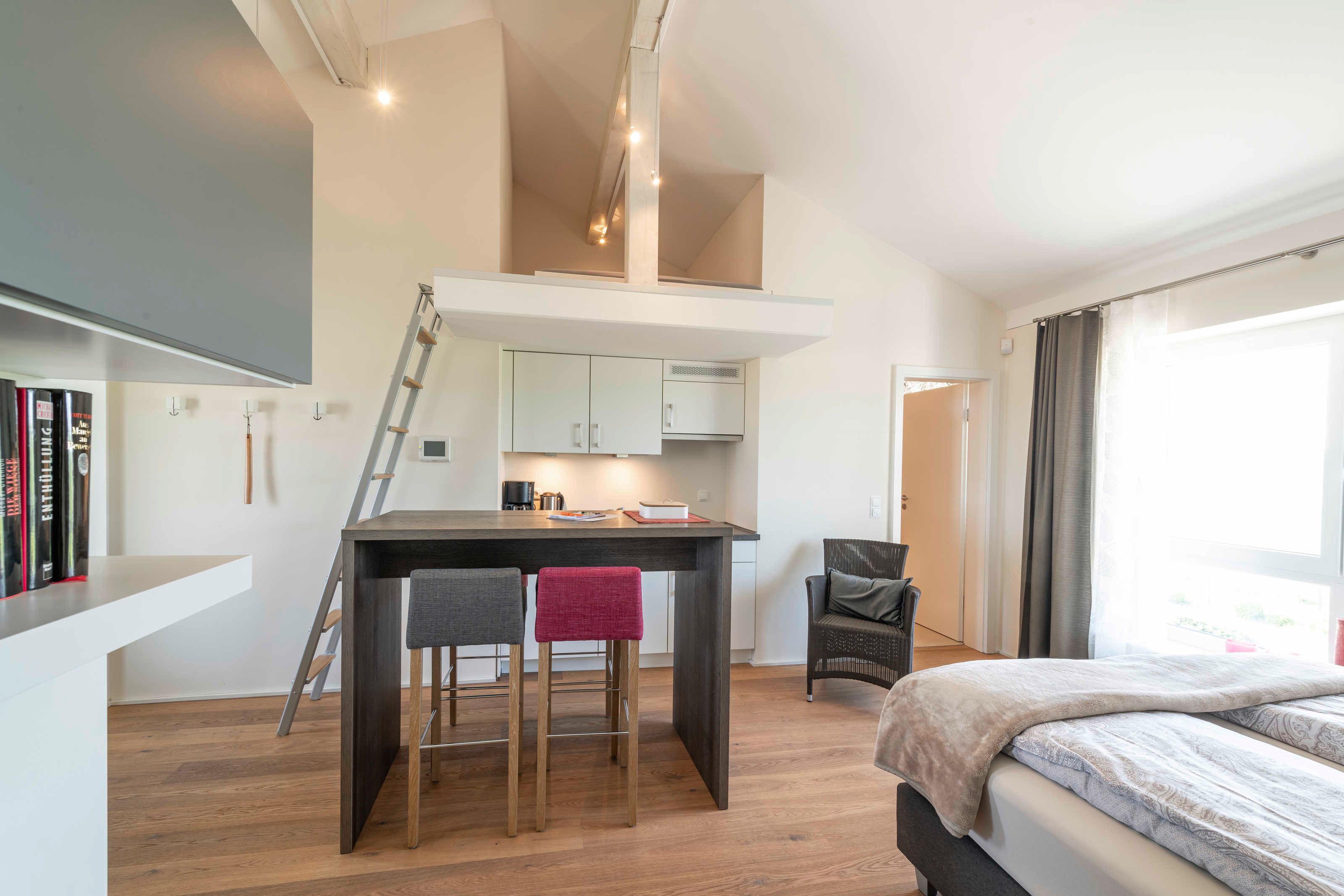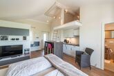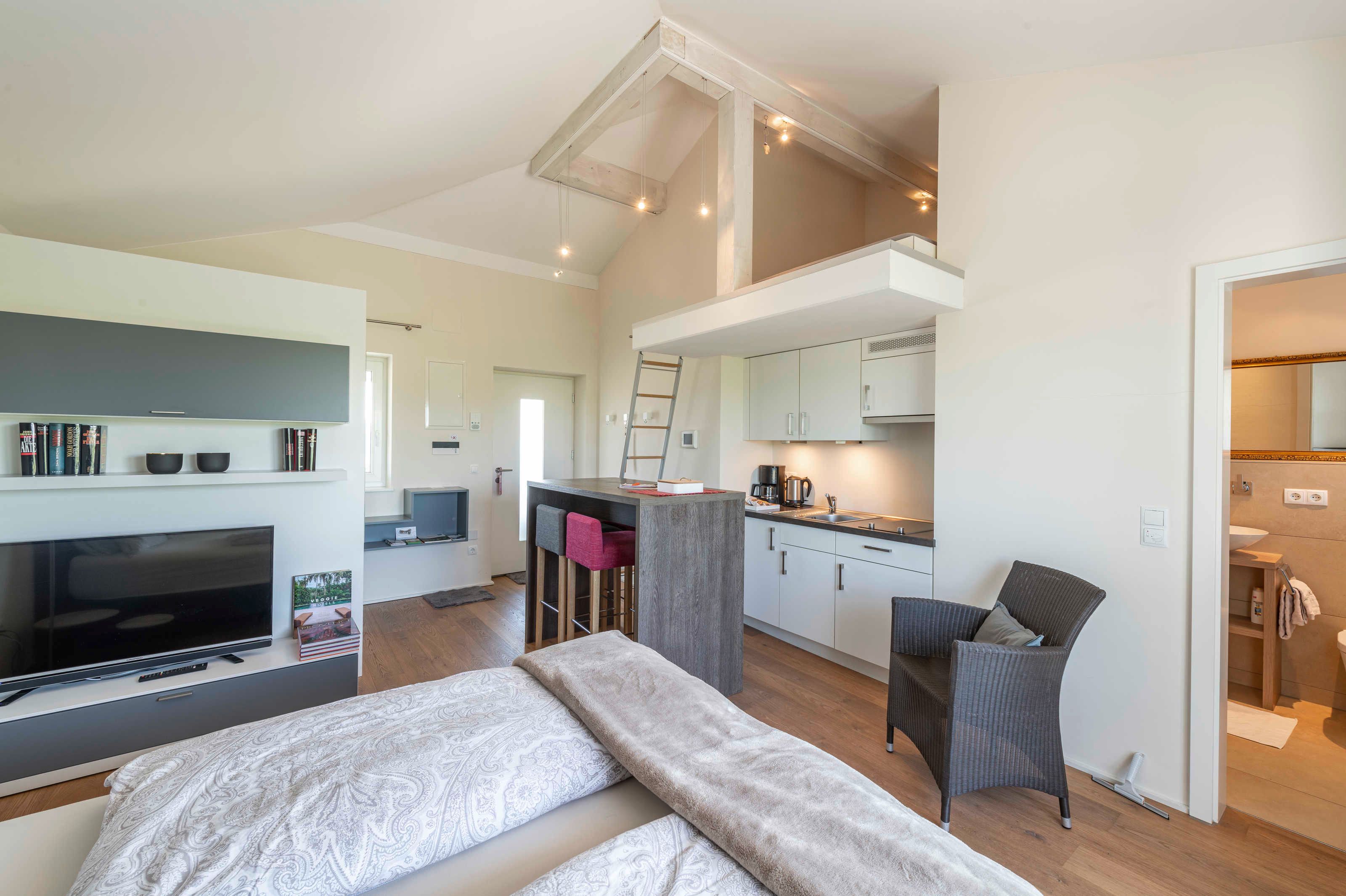 Unser Ferienappartement “Sophienberg”, ist ca. 30 qm² groß, für max. 2 Personen, Wohn-, Schlafzimmer und Kochnische mit 2-Plattenceranfeld, Kühlschrank, Wasserkocher, Kaffeemaschine, Toaster.