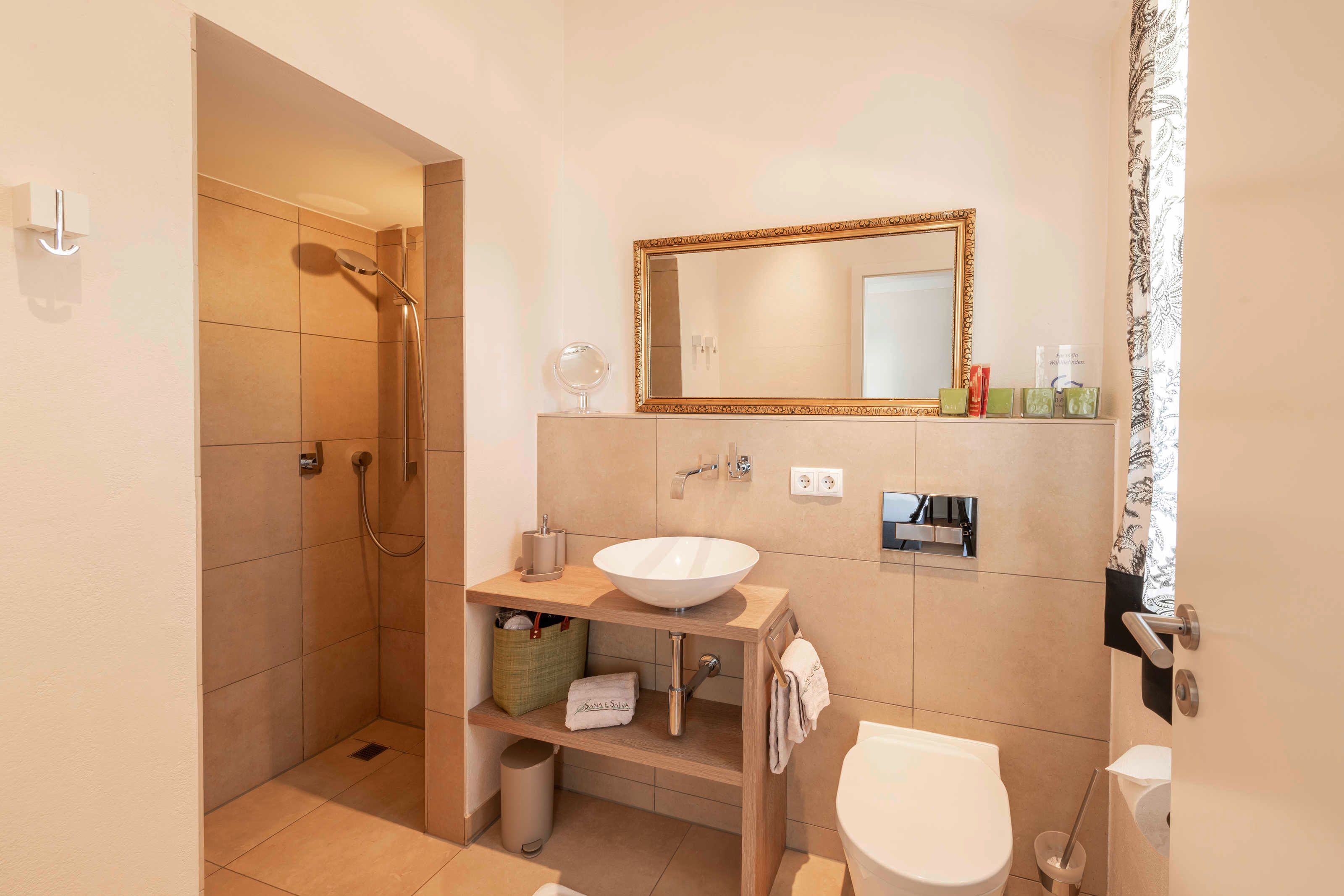 • In den Bädern befinden sich Fön, Schminkspiegel, Badeschuhe, Biocremeseife