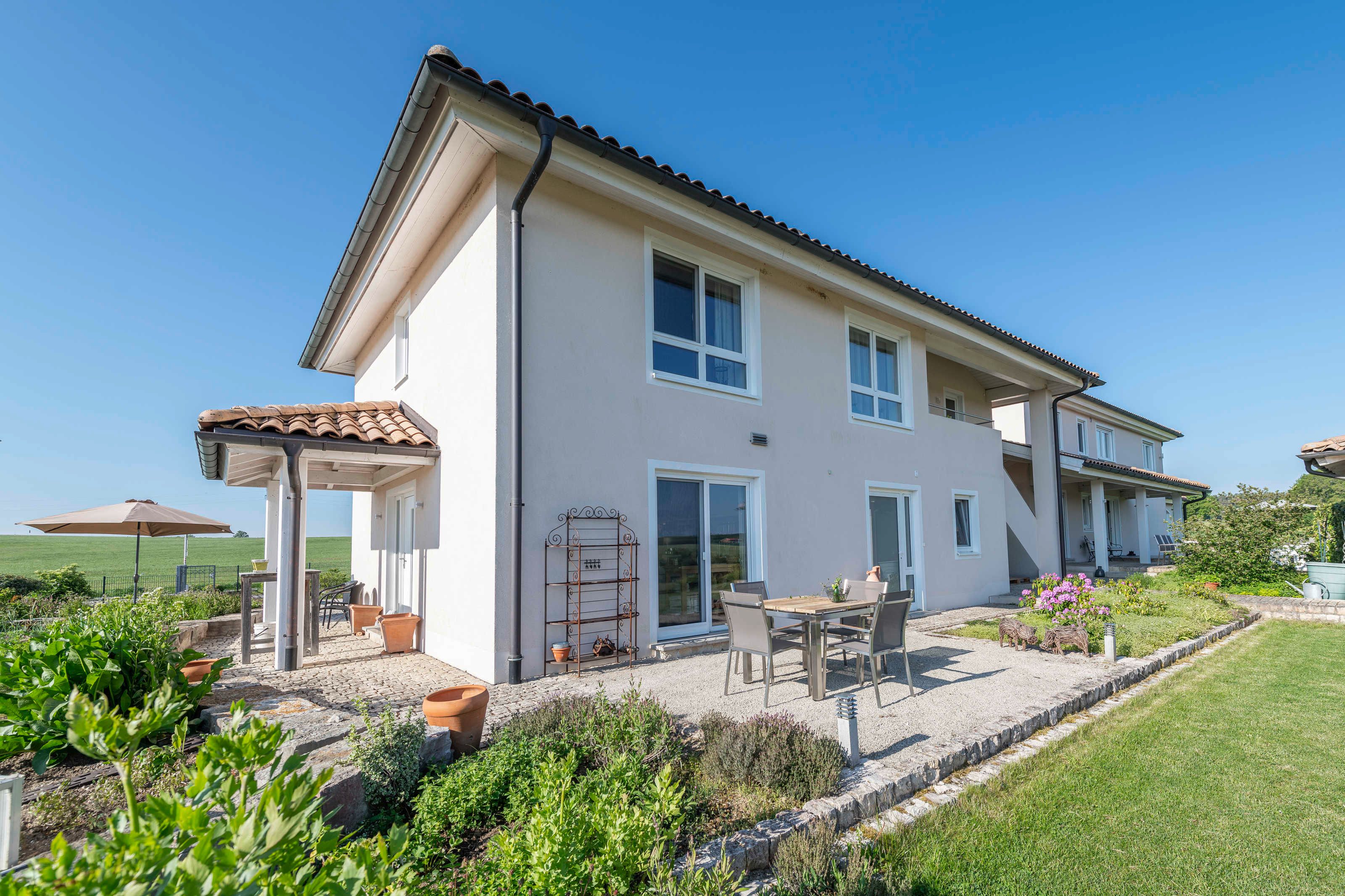 Unsere ausgewählten Baumaterialen haben wir unter dem Aspekt umweltbewusst und nachhaltig ausgesucht. Wir nutzen eine Solaranlage für das heiße Wasser und wir haben uns für eine nachhaltige Entwässerungstechnik durch eine Regenwasserzisterne entschieden. Ein behaglicher Wohnkomfort mit einem gesunden Raumklima wird durch unsere Granderwasseranlage für die Fussbodenheizung unterstützt.