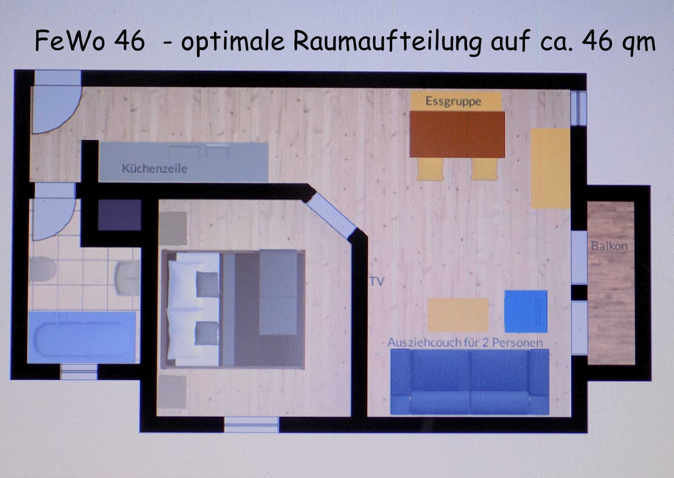 Unsere Fewo 46, ca .44 qm, bietet Platz für 3-4 Personen.