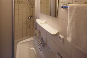 Kleines, sehr helles Zimmer in der ersten Etage mit Dusche / WC / TV / WLan, Bett 160x200cm, Echtholz-Parkettboden. Zimmer ca. 8,4 m² und zusätzl. Badezimmer mit 2,2 m².
