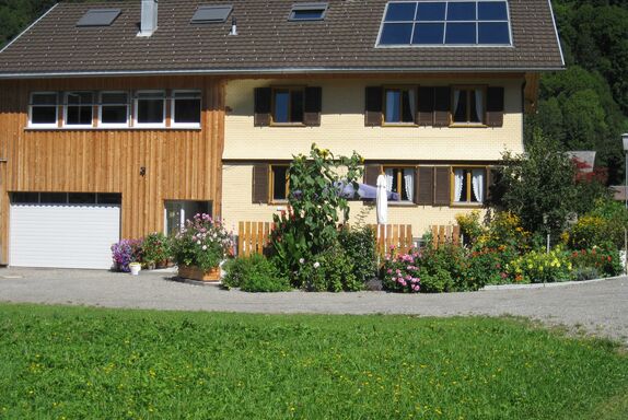Unser Haus liegt in sonniger, ruhiger Lage nahe dem Dorfzentrum von Bizau mit wunderschönem Ausblick.