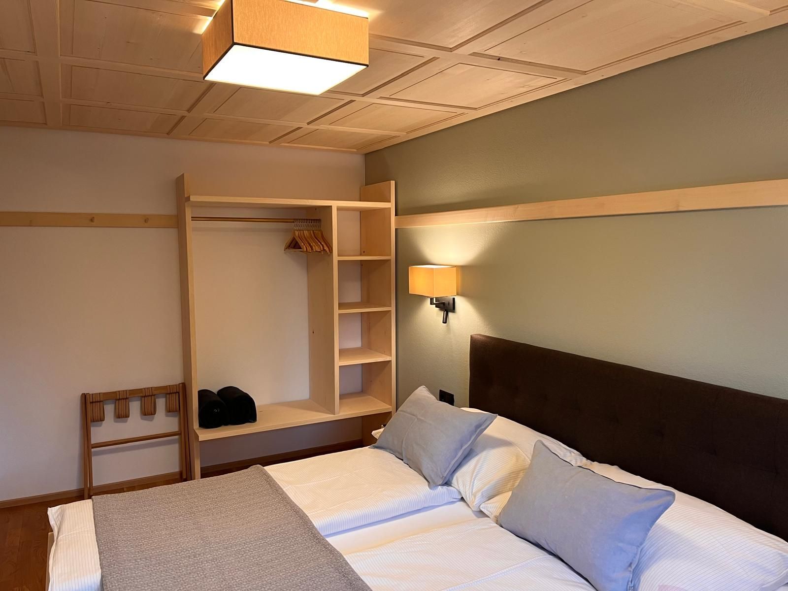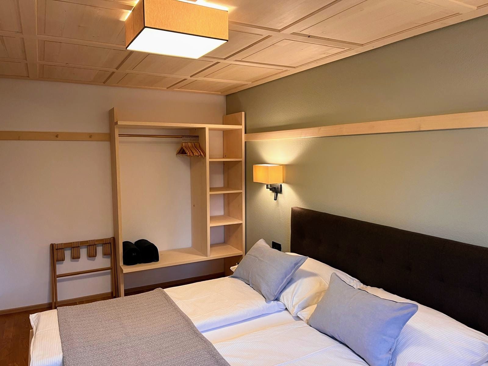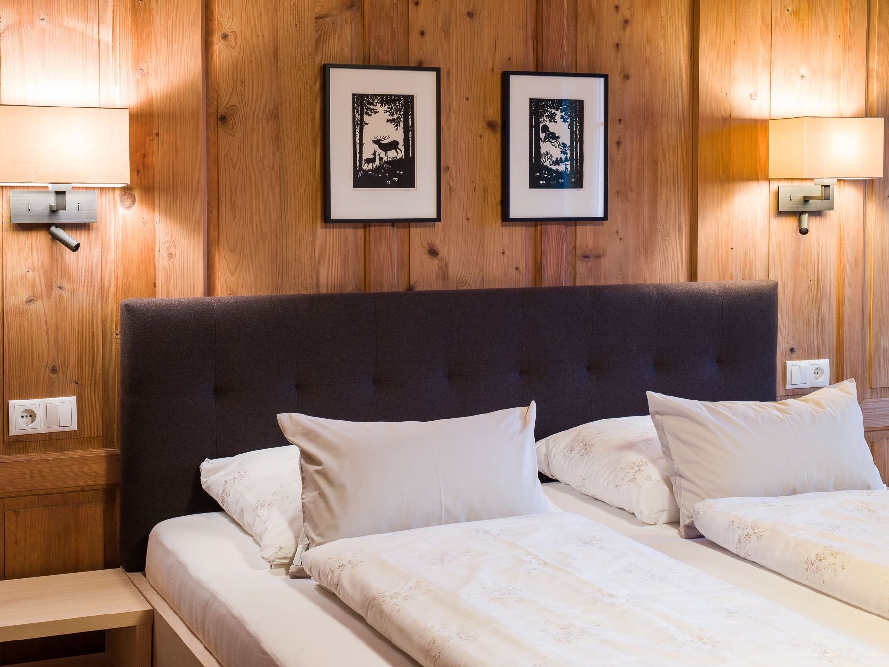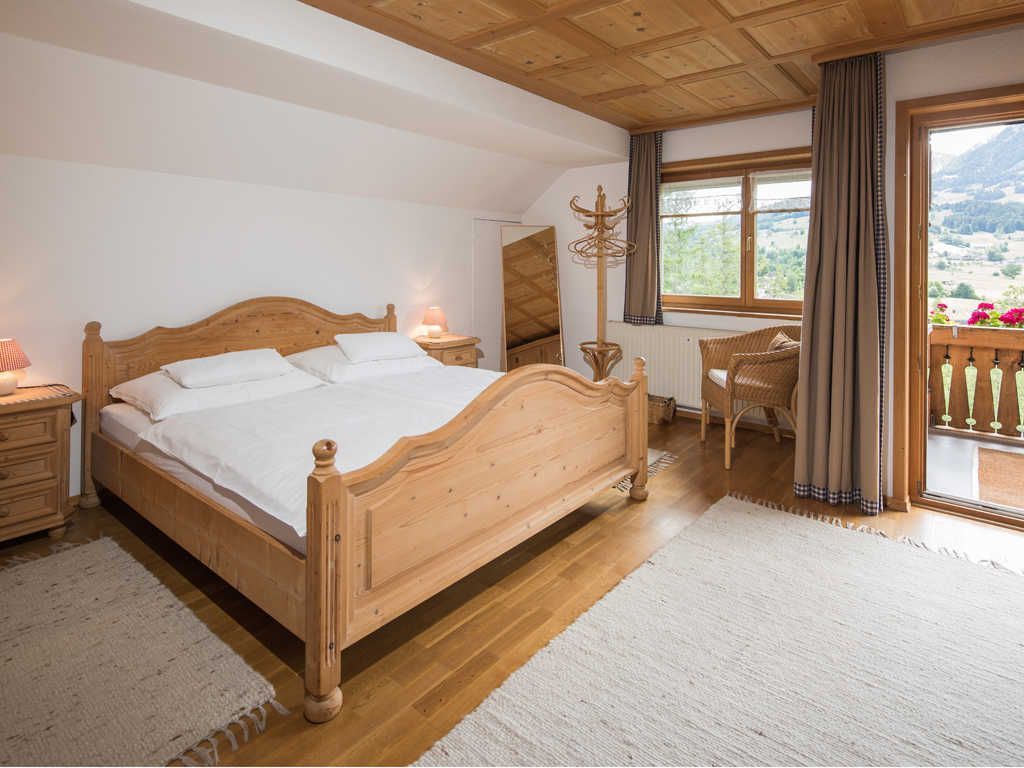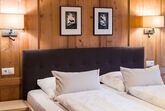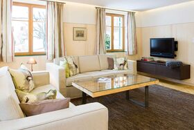 Eine sehr elegantes, großzügiges Wohnzimmer und geräumiges Schlafzimmer mit jeweils Zugang zum großen Balkon und herrlich freiem Blick in die Berge.