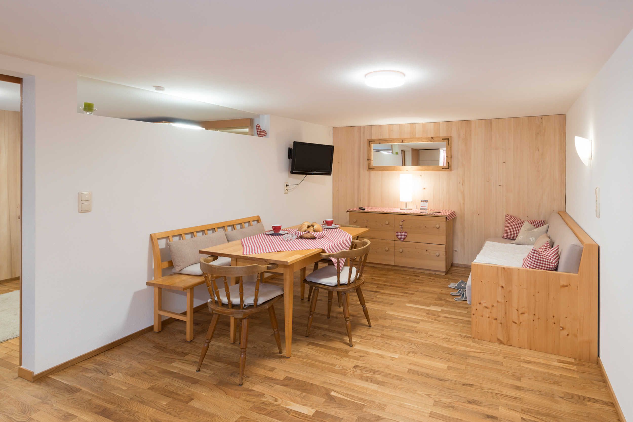 Unsere Ferienwohnungen besteht aus einer geräumigen Wohnküche mit Esstisch, einer Sitzecke (Schlafcouch) und einem TV, einem separaten Schlafzimmer, welches an das mit Dusche mit WC ausgestattete Bad grenzt.