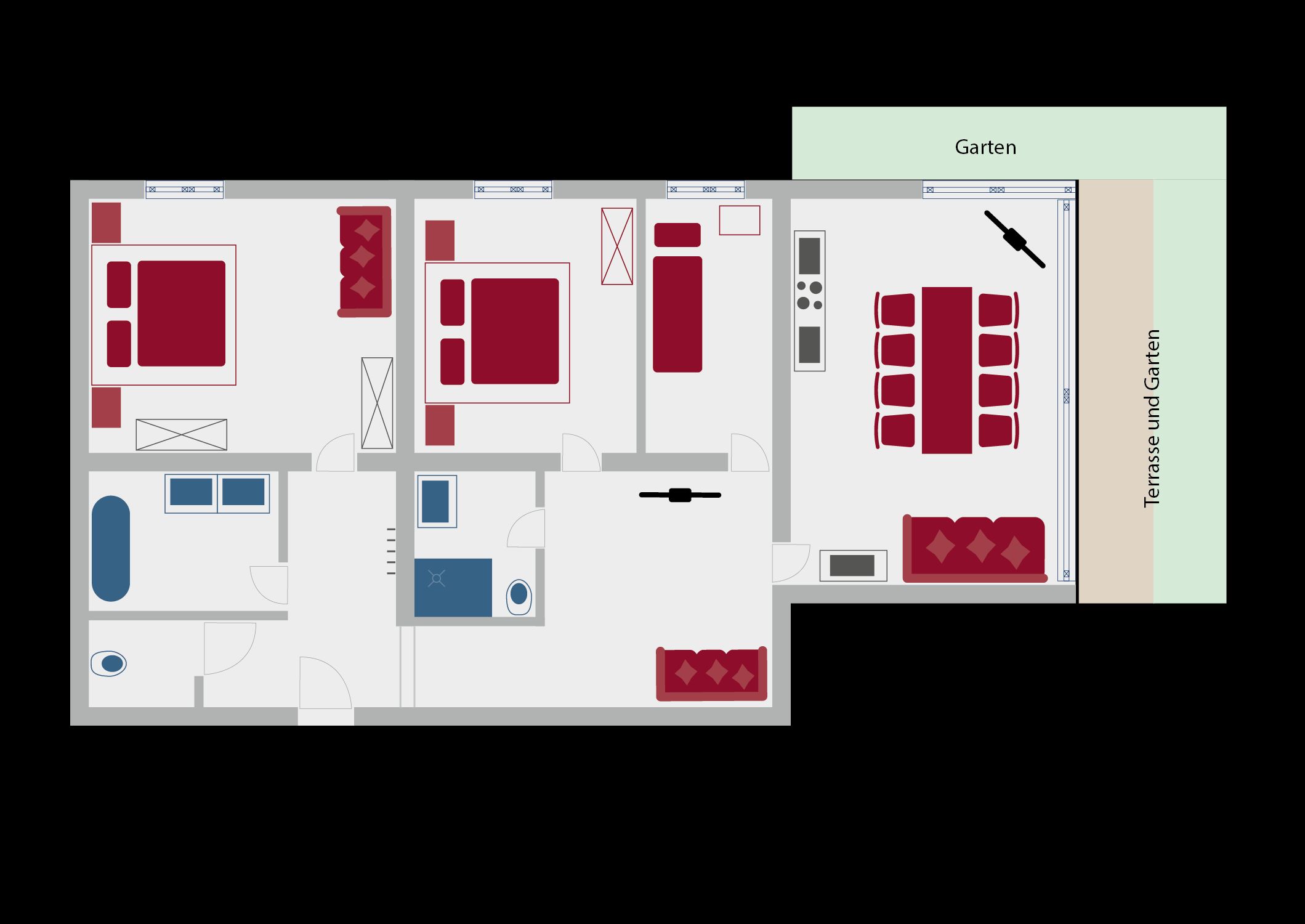 Ihr Wintergarten Apart Vanessa (ca. 80 m²) besteht aus: 1 Doppelzimmer mit Zusatzcouch (1 Person), 1 Badezimmer mit seperatem WC, 1 extra Doppelzimmer, 1 Einzelzimmer, 1 Bad mit DU/WC und 1 Schlafsofa (1 Person) in der Diele. Die Wohnküche mit Sat-TV, Telefon, ihr persönliches I-Pad und großzügigem Esstisch verfügt über eine komfortable Kochnische mit Geschirrspüler, Mikrowelle, Kühlschrank mit Gefrierfach, Wasserkocher, Toaster, Kapselkaffeemaschine, Sodastream und direktem Zugang zum Garten und der Terrasse mit Gartenmöbeln. Kombi-Appartement: Möglichkeit zum Kombinieren von mehreren Appartements nebeneinander für Groß-Familien oder Gruppen.