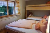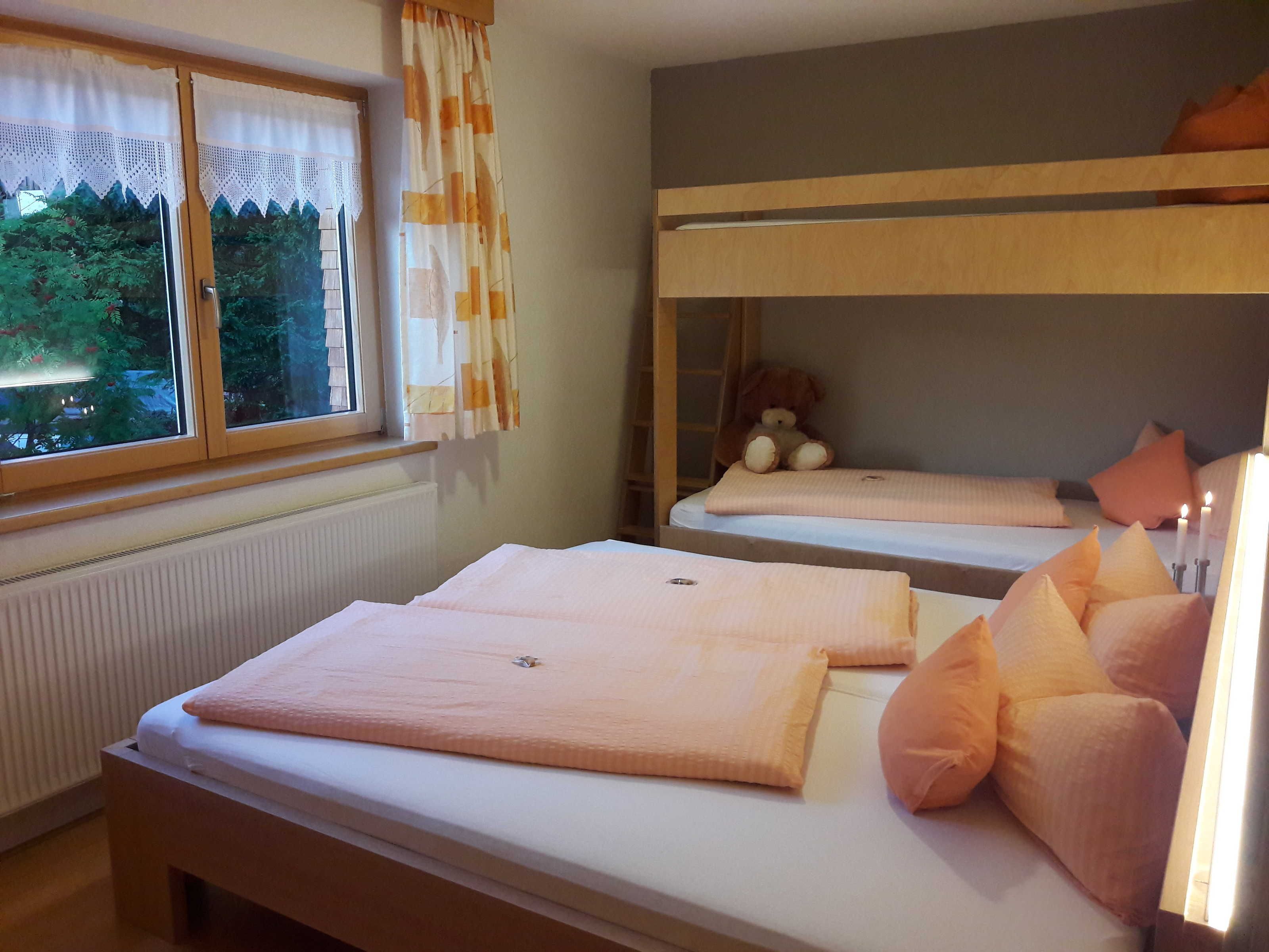 Großzügige Appartement, 53m² für 4 6 Personen, befinden sich im 1. Stock, mit Balkon und Ausblick über unser herrliches Panorama, ausgestattet mit zwei Doppelzimmer, eines davon mit zusätzlichem Hochbett, einem großen Badezimmer mit Dusche und WC, Handuchwärmer, Fön und Kosmetikspiegel
