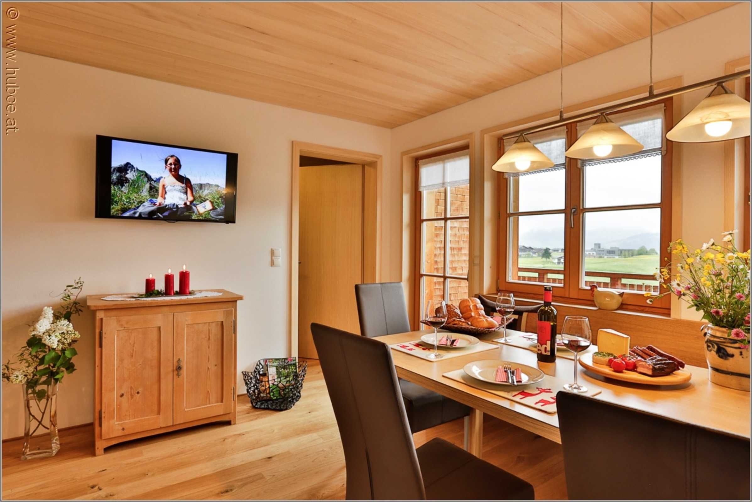 Auf 55 m² befinden sich eine großzügig gestaltete und einladende Wohnküche, 2 Schlafzimmer, Badezimmer und ein Balkon, der die Aussicht auf Wiesen und Felder und die Bergwelt des Bregenzerwaldes freigibt.