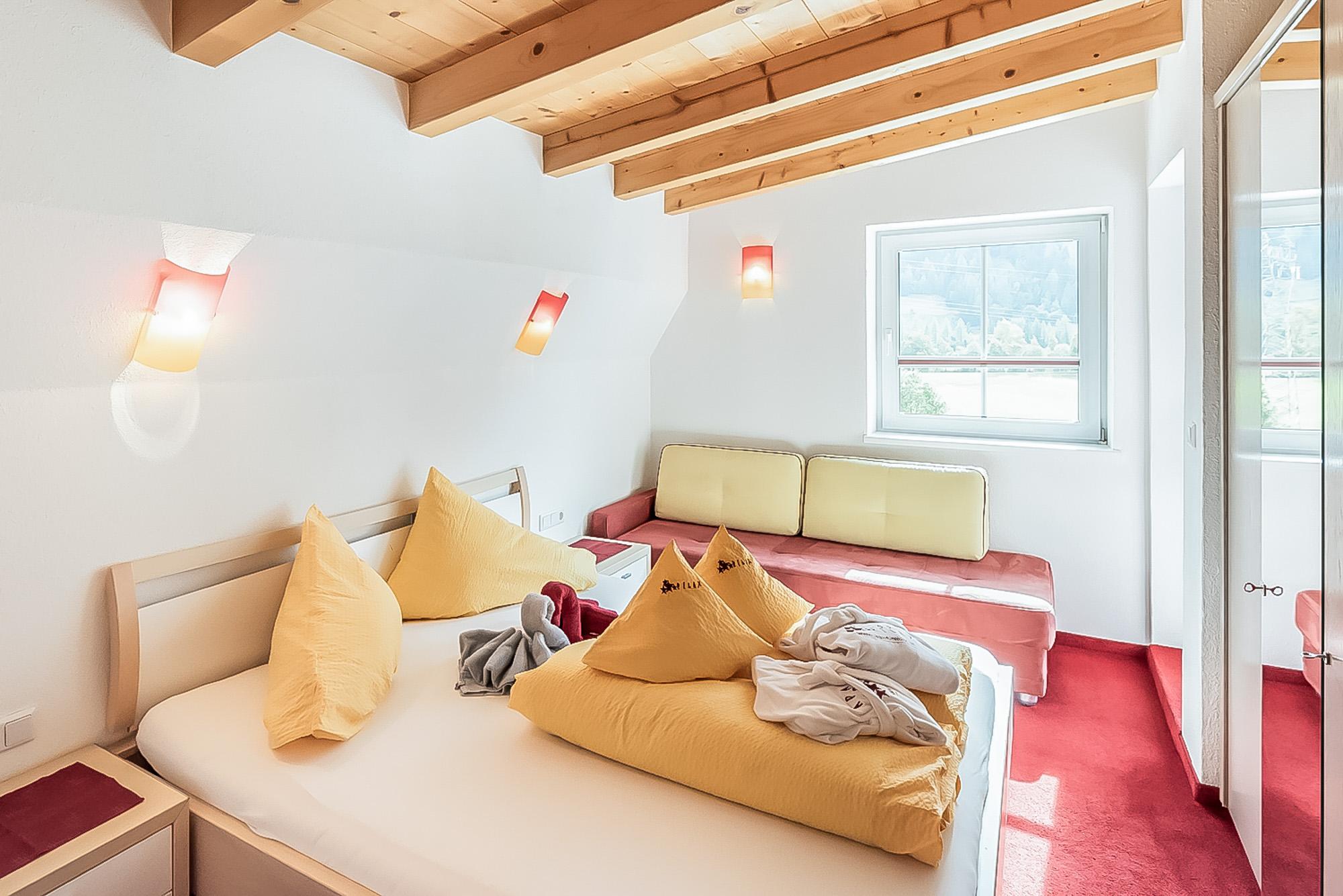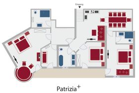 Ihr extra grosses Familien-Appartement Patrizia Plus mit ca. 112 m² besteht aus dem Apart Patricia, welches durch eine Verbindungstür um 2 Schlafzimmer und ein Badezimmer erweitert wird: 2 Doppelzimmer, 1 Dreibettzimmer, 1 kleines Schlafzimmer mit Etagenbett, 1 Badezimmer mit Bad/Duschkombination und WC, 2 Badezimmer mit Dusche/WC, komplett eingebaute Komfort-Küche (Geschirrspüler, Mikro, Toaster, Wasserkocher, Sodastream, uvm…), lichtdurchfluteter sehr großer Essbereich, Sat-TV, I-Pad, optisch getrennter Wohnbereich mit Ausziehcouch für 2 Personen, südwestseitig gelegener Balkon über die ganze oberste Etage mit herrlicher Aussicht auf die Berge