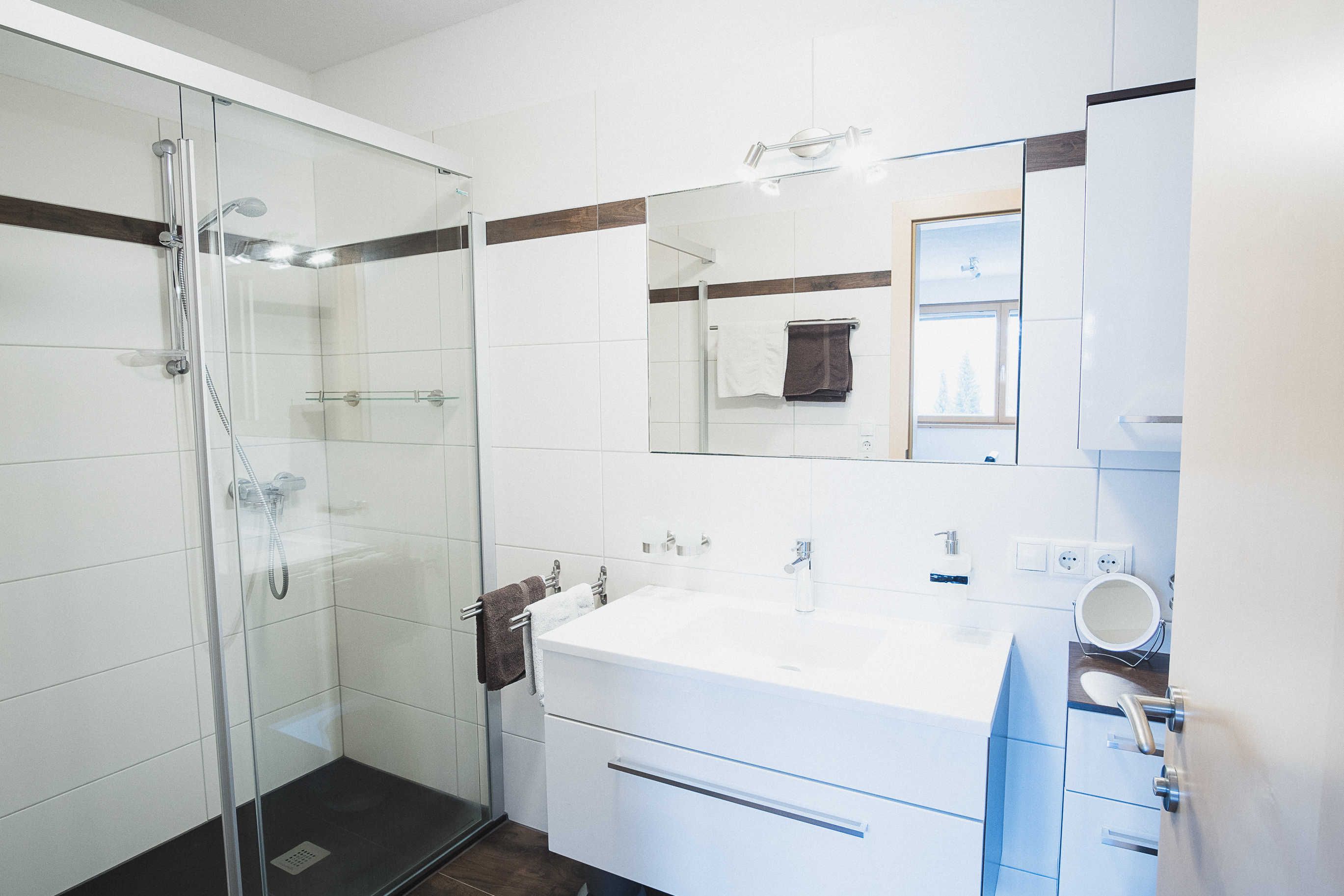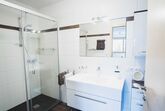 • Großes Badezimmer mit Dusche, WC, großes Waschbecken und Badschrank