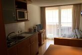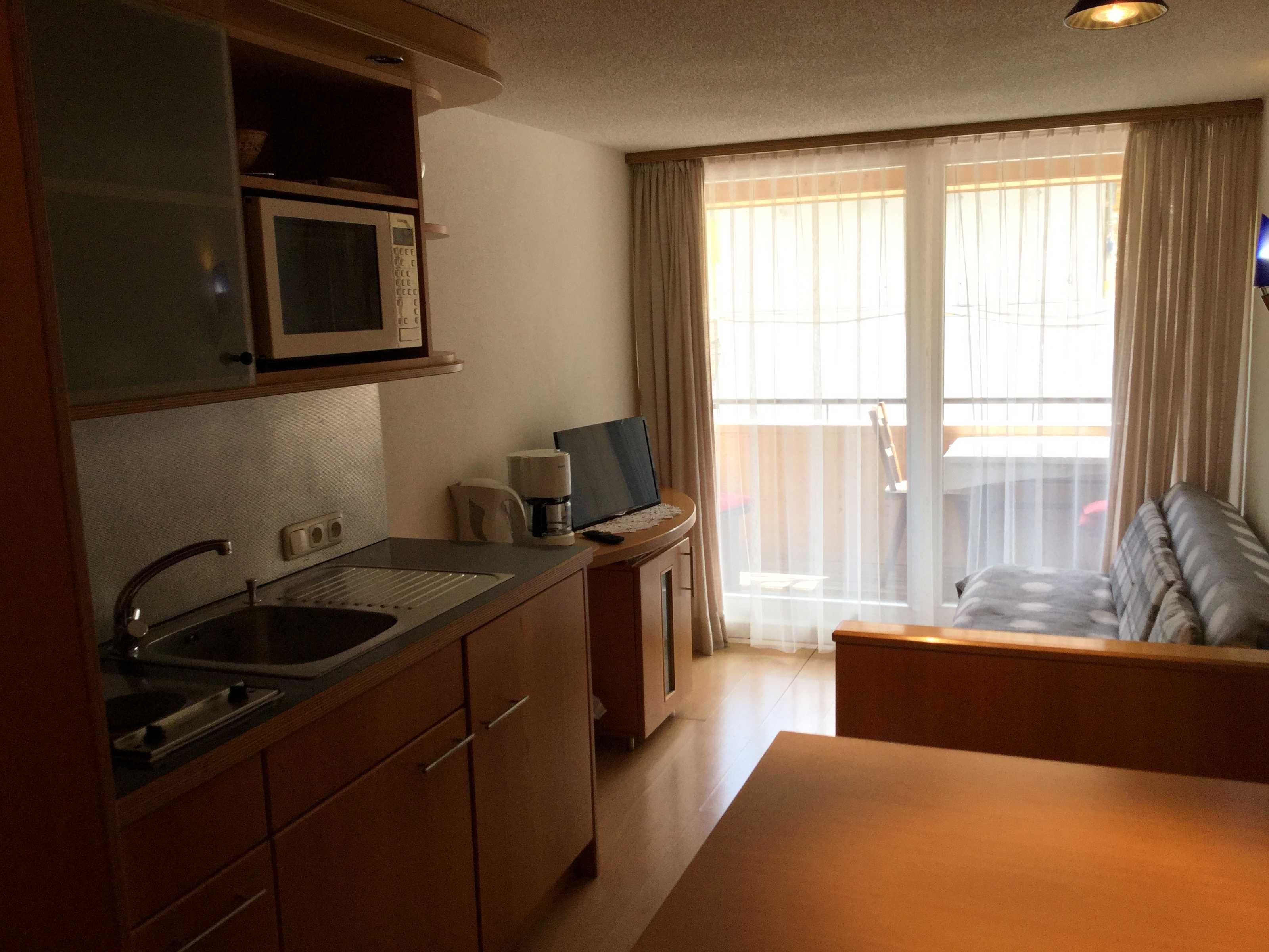 Familien-Appartement mit Küche, Wohnschlafzimmer mit Ausziehcouch für 1 Person, Schlafzimmer für 2 Personen, Dusche/WC, TV und Balkon.