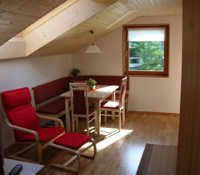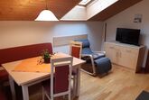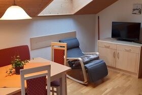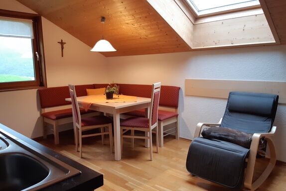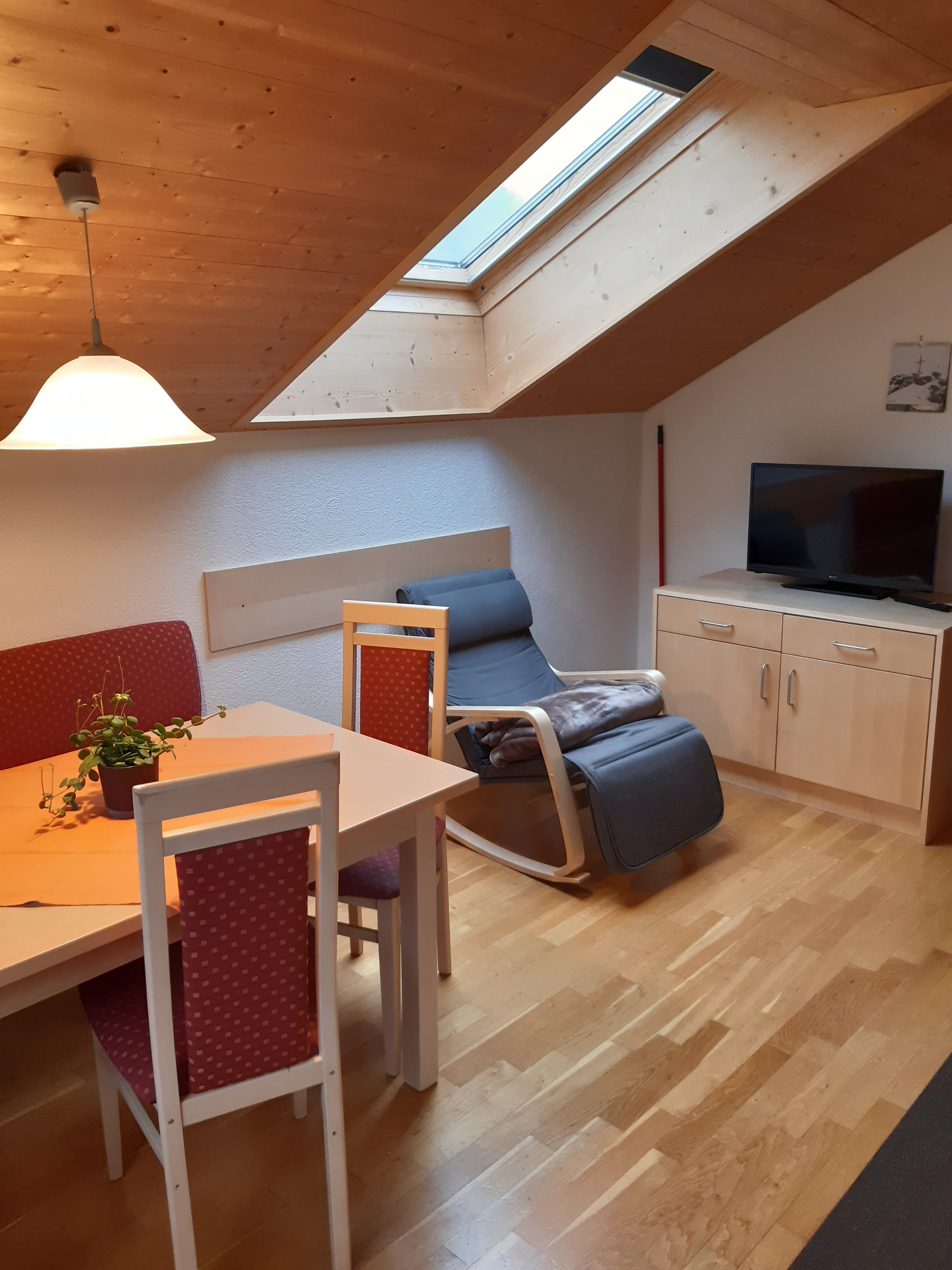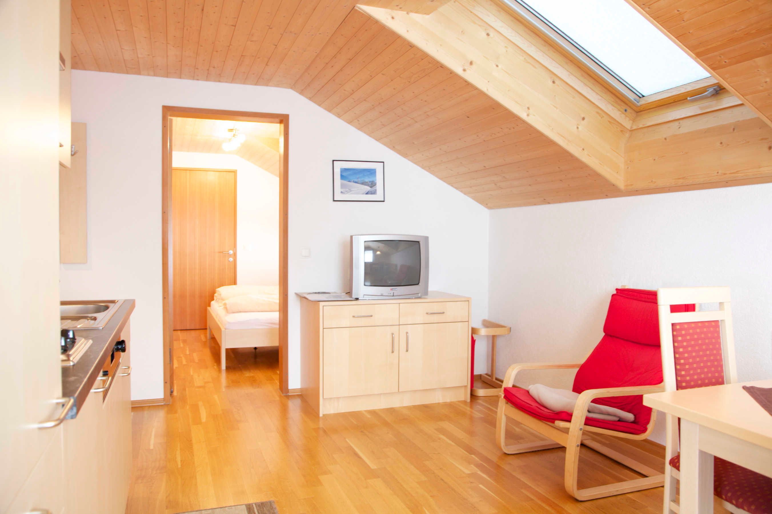 Unsere Wohnung Dorfblick verfügt über eine helle Wohnküche mit Fernsehsessel, separates Schlafzimmer, Dusche/WC, SAT-TV mit Flachbildschirm, kostenloses WLAN, und Balkon mit herrlichem Ausblick auf Schoppernau.