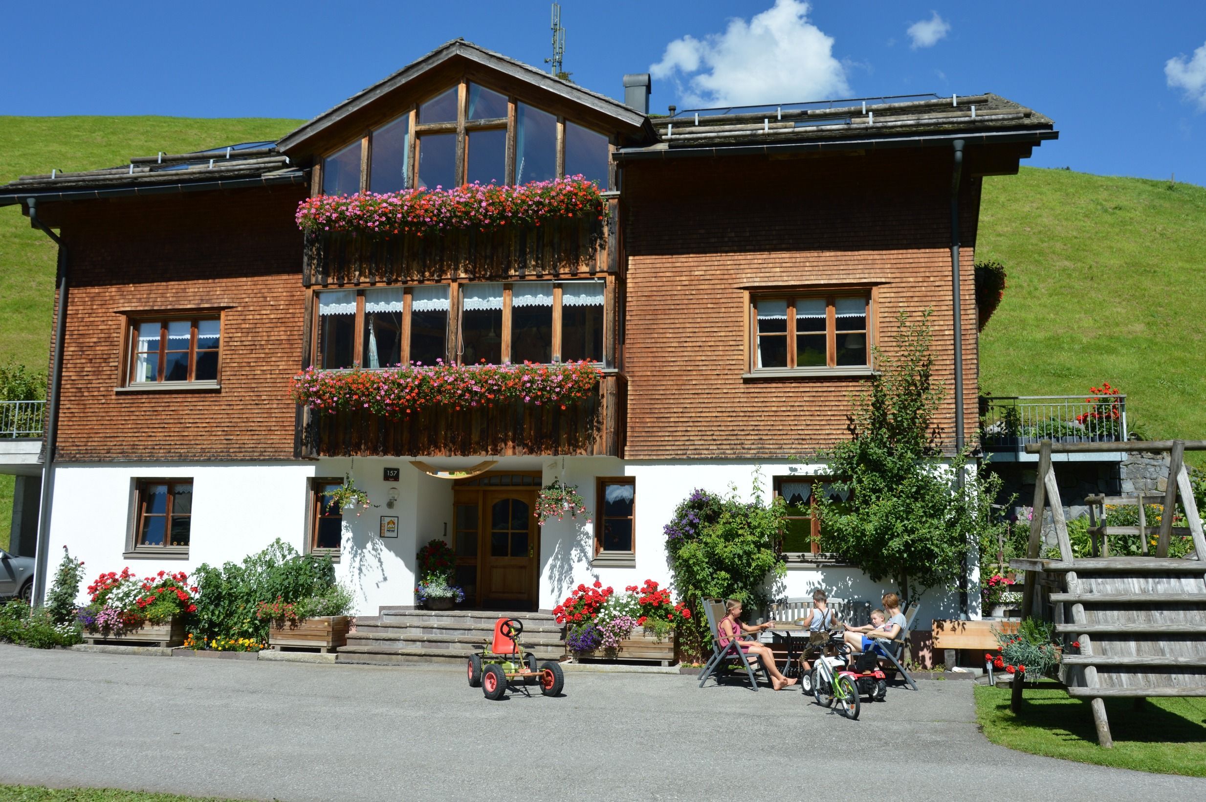 Unser Haus liegt mitten im Grünen am Südhang von Schoppernau, mit einer wunderschönen Aussicht auf die umliegende Bergwelt. Spielhäuschen, Tischtennis, Schaukel, Dart, Tischfußball und eine kleine Bibliothek stehen Ihnen bei uns zur Verfügung.