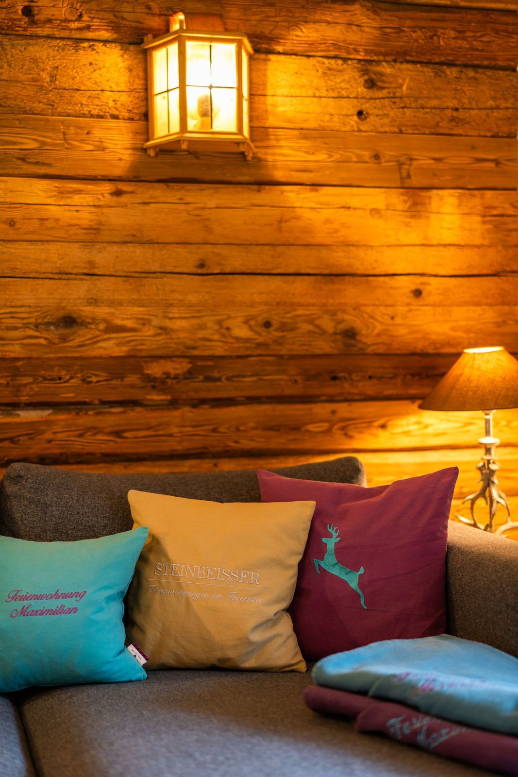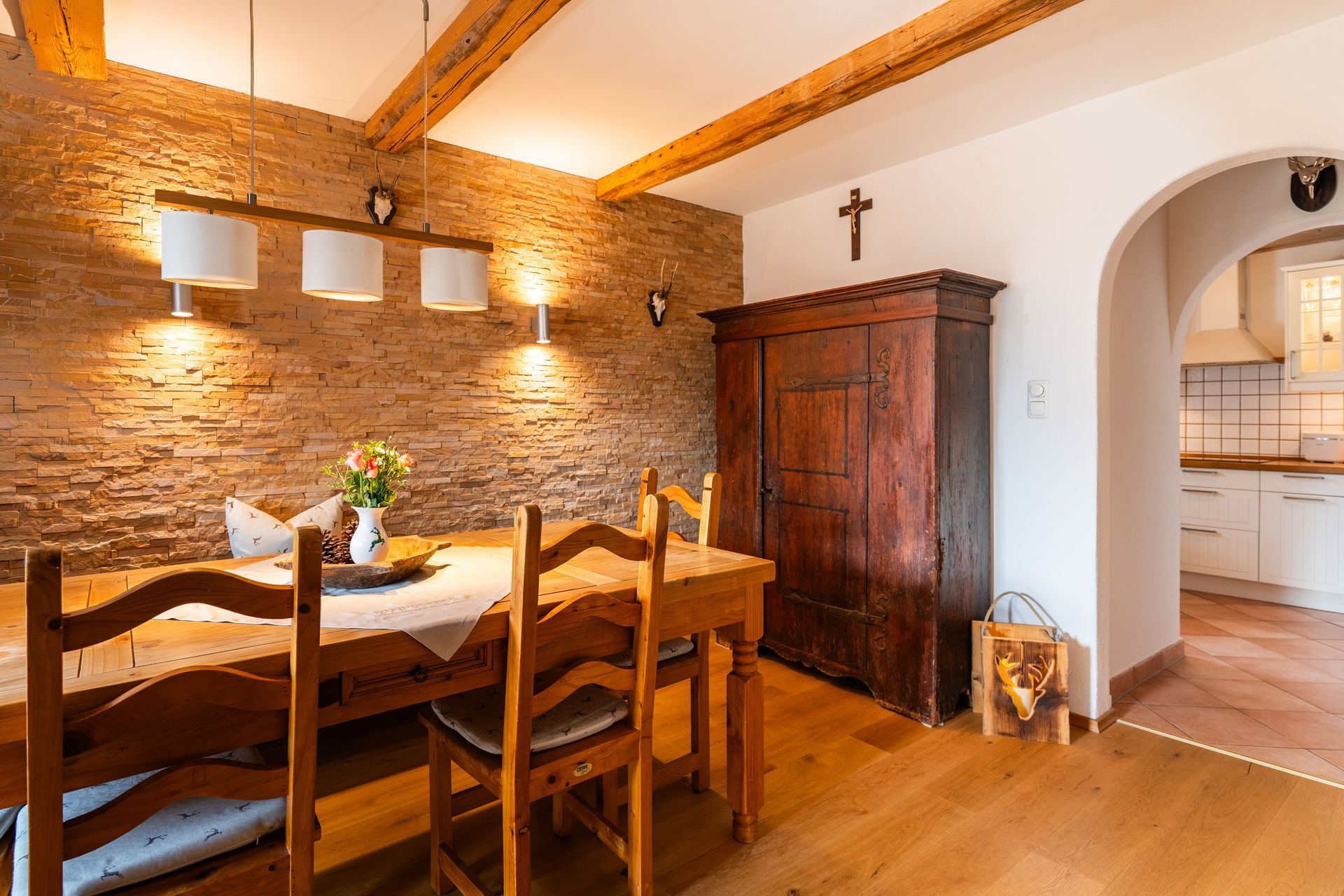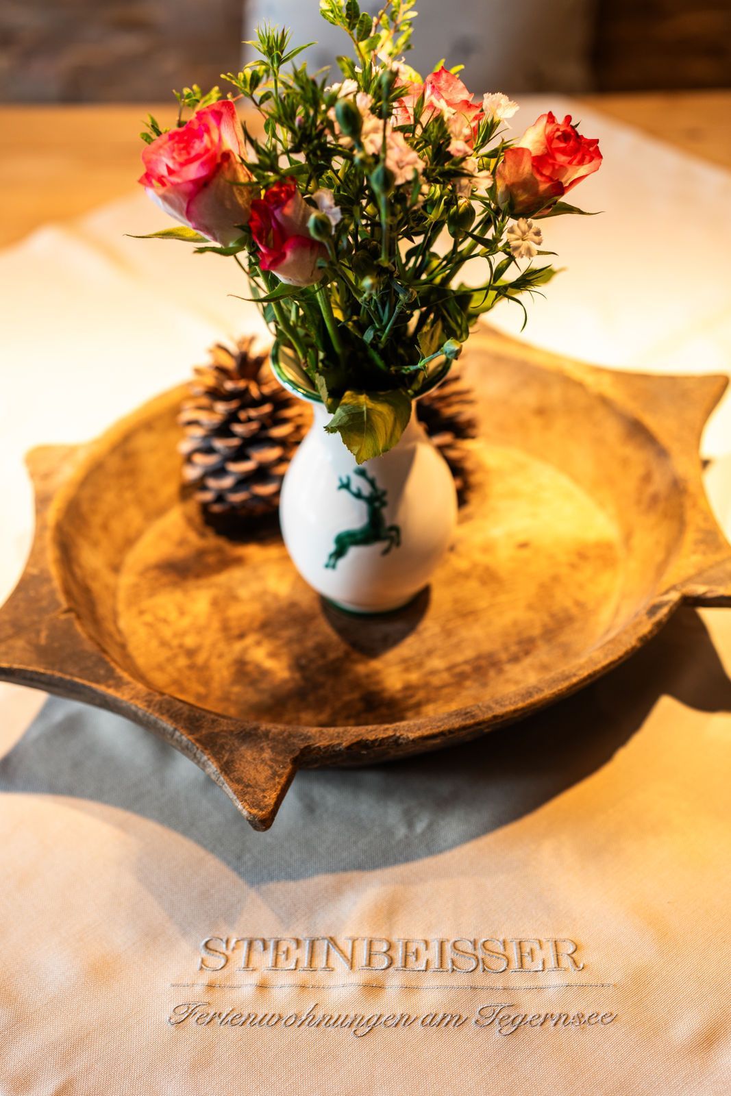 Die gemütliche und laufend renovierte ****Nichtraucherwohnung mit 4 Zimmern, separater Küche, zwei Bädern, extra Gäste-WC und Diele, erstreckt sich über das komplette 1. Obergeschoss des Hauses. Dadurch haben Sie in Ihrer Ferien-Unterkunft keine störenden Nachbarn neben sich. Hochwertig und rustikal aber modern im oberbayerischen Stil ausgebaut, werden Sie sich von Anfang an wie zu Hause fühlen. Hier treffen alte Materialien auf neue Technik. Verkleidungen und Einbauten wurden mit viel Liebe zum Detail aus echtem Altholz gefertigt, die Fußböden sind mit Landhausdielen ausgelegt. Hochwertige Stoffe schaffen eine gemütliche Atmosphäre. Im großzügigen Wohnbereich befindet sich ein holzbefeuerter Kaminofen für die kalten Tage, im daran anschließenden Esszimmer steht ein großer Holztisch für gesellige Stunden. Die voll ausgestattete Küche mit Induktionsherd, Backofen, smartem Side-by-Side Kühlschrank und Spülmaschine lässt keine Wünsche offen. Nespresso- sowie normale Kaffeemaschine, Wasserkocher und Toaster sind dort ebenso selbstverständlich wie ausreichend Geschirr und Besteck. Hier finden Sie auch eine Waschmaschine sowie einen Trockner vor (gegen Gebühr). Beide Badezimmer bieten Ihnen neben Waschtisch mit zusätzlichem Kosmetikspiegel und Haartrockner zeitgemäße Regenduschen. Auf dem überdachten und regengeschützten Balkon befinden sich ausreichend Sitzmöglichkeiten. Gerne können Sie sich aber auch auf der Liegewiese hinter dem Haus mit einem guten Buch entspannen. Liegestühle, Gartenmöbel und ein Außengrill stehen dort zu Ihrer freien Verfügung. Frische Bettwäsche, kuschelige Bademäntel und Handtücher sowie Endreinigung sind im Preis enthalten, ebenso wie die Tegernsee-Card für jeden Gast.