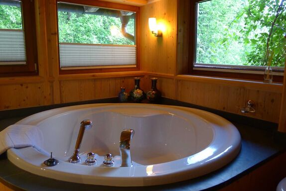 NEU: Seit Oktober steht unseren Gästen ein 40 qm großer Wellnessbereich mit Sauna, Dusche, Ruheraum und freistehender Holzbadewanne mit Panoramablick auf den Garten frei.