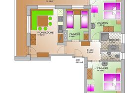 Unsere Ferienwohnung ist mit 3 Schlafzimmer, davon sind 2 Doppelzimmer und ein Zimmer mit zwei Einzelbetten, Badezimmer mit Dusche, einem seperaten WC, einer Wohnküche mit Geschirrspüler, Mikro usw. ausgestattet.