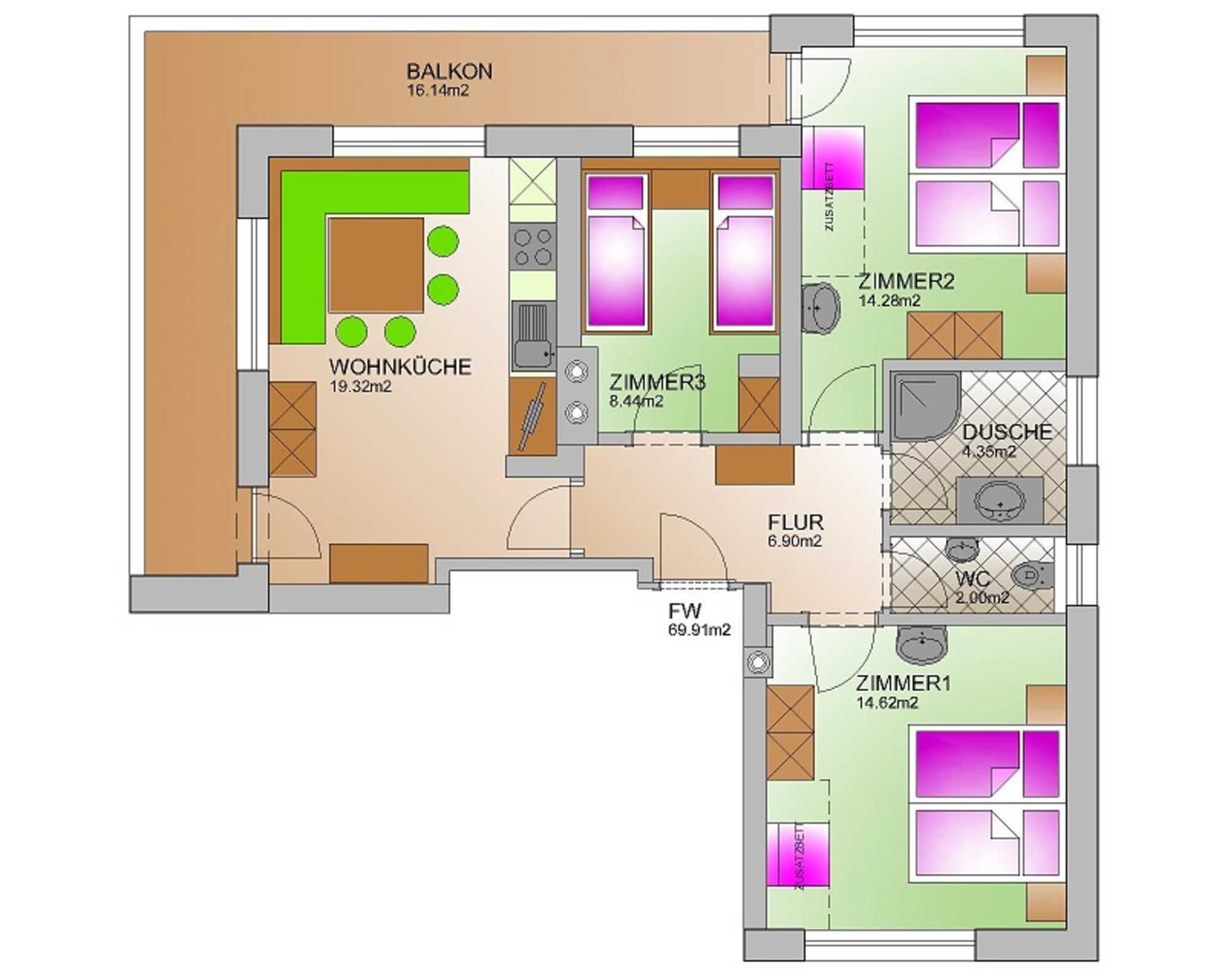 Sie bietet Platz für 2 bis 6 bzw. 7 Personen - Zusatzbetten.