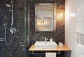 • Ein Badezimmer mit Dusche, Waschbecken und WC